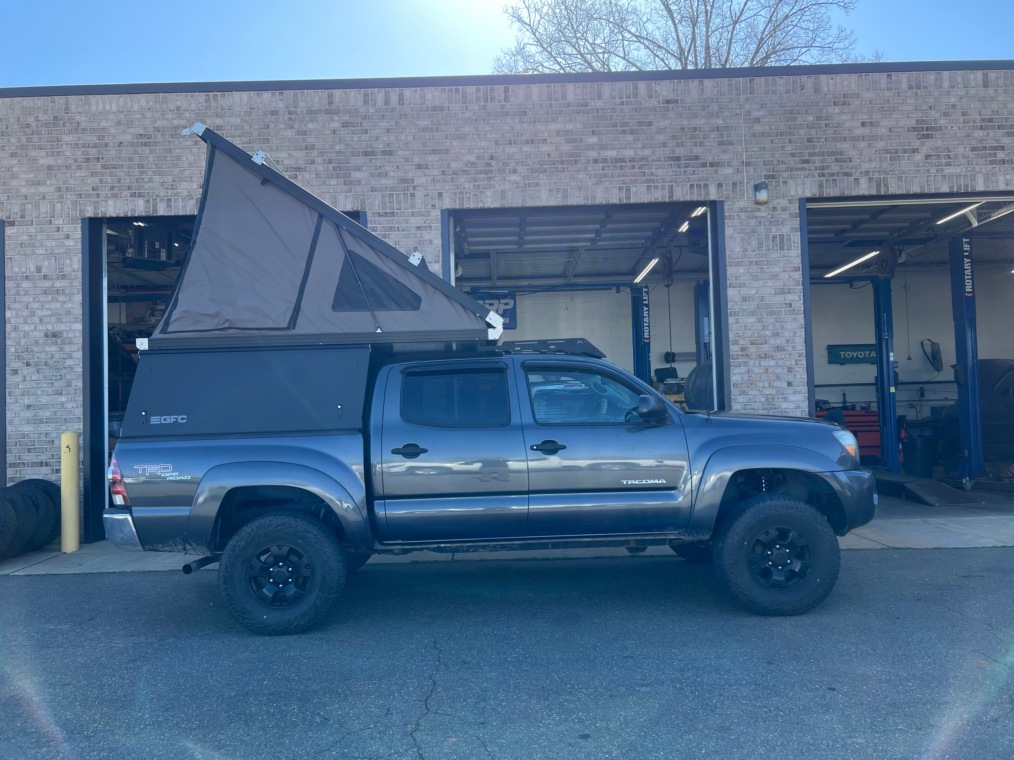 This 2009 Toyota Tacoma is outfitted with a GFC Platform Camper with Black panels and a Stone Grey tent. Check out more build specs below.