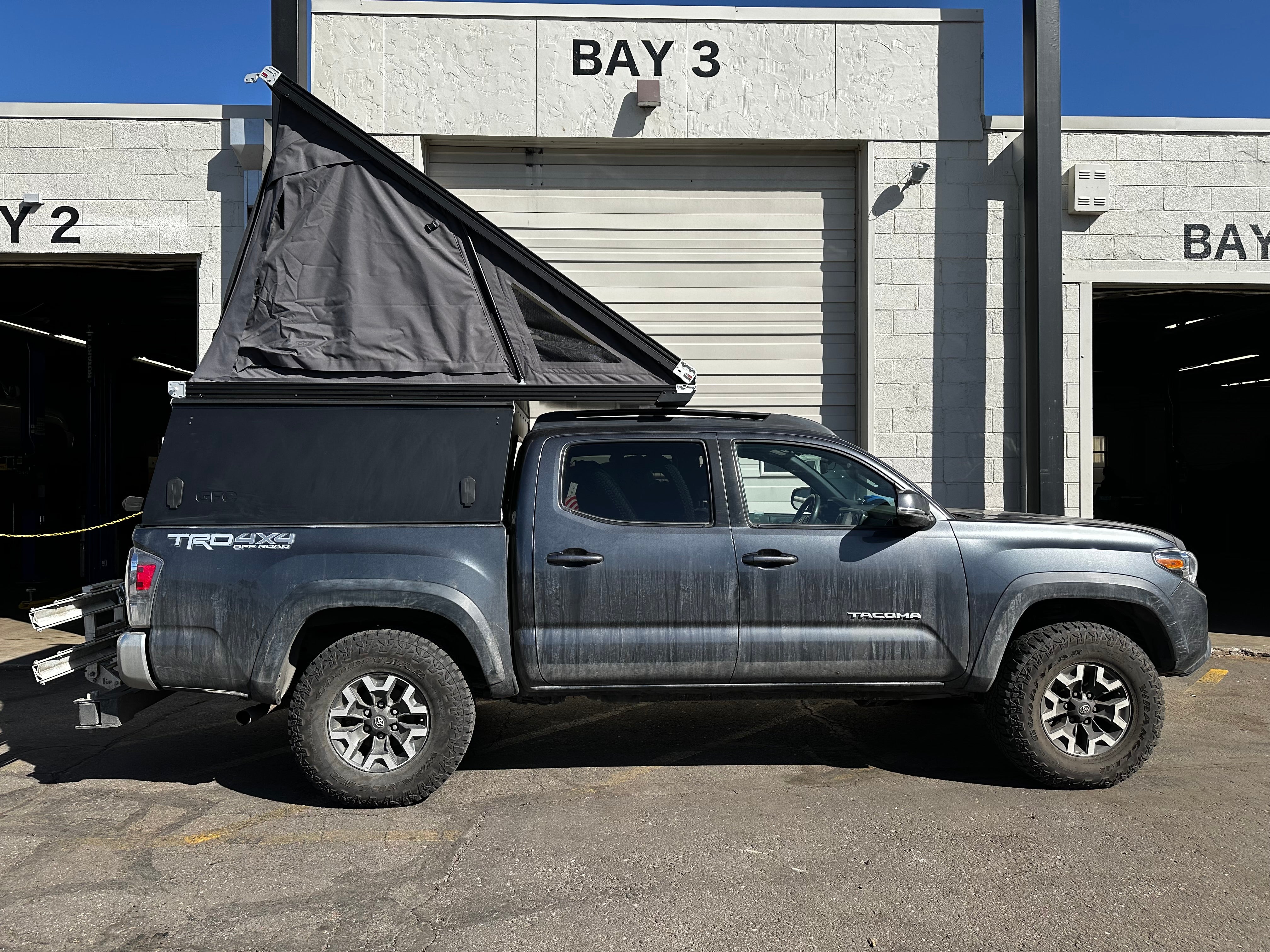 This 2019 Toyota Tacoma is outfitted with a GFC Platform Camper with Black panels and a Stone Grey tent. Check out more build specs below.