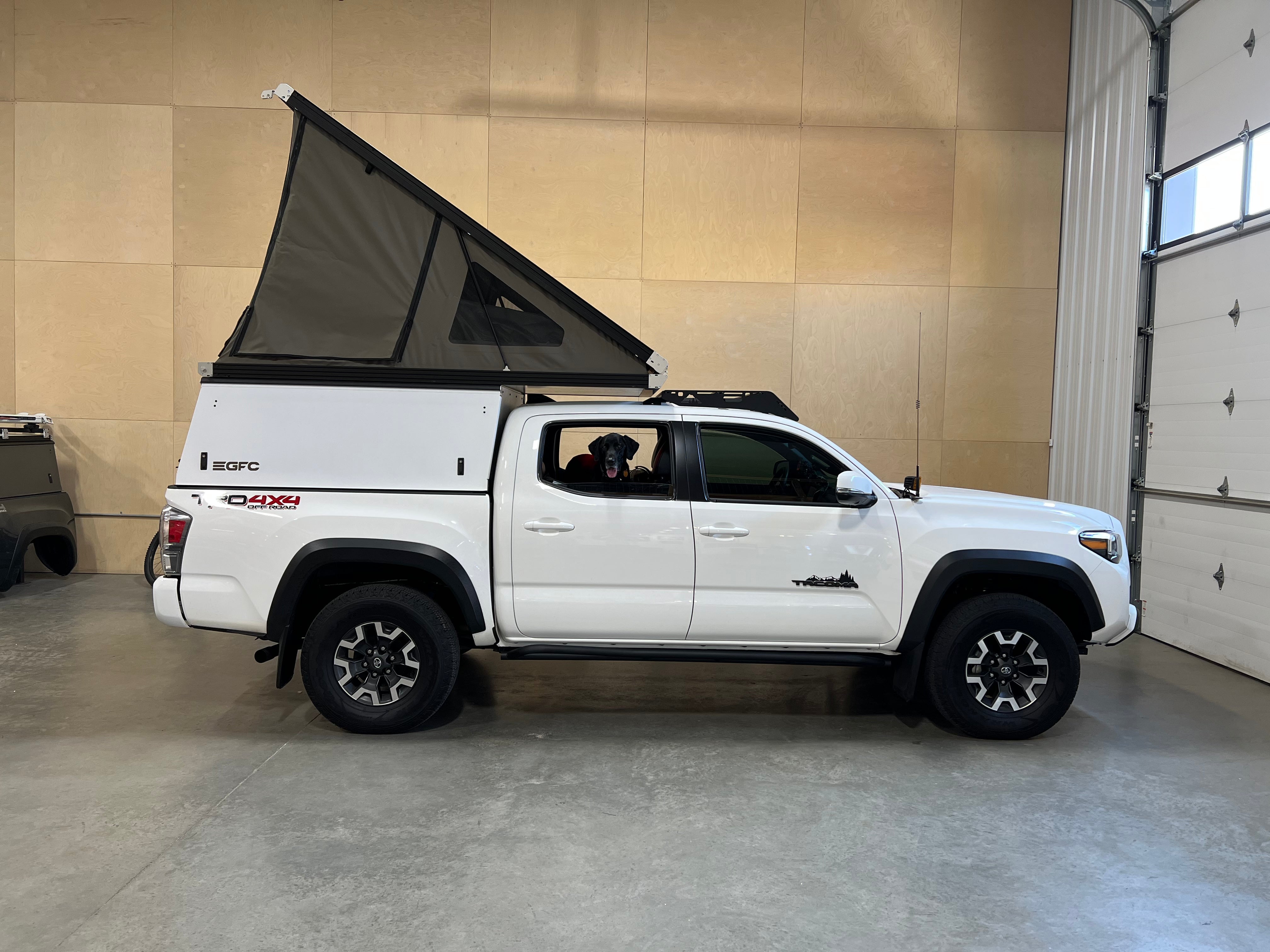 This 2021 Toyota Tacoma is outfitted with a GFC Platform Camper with White panels and a Stone Grey tent. Check out more build specs below.