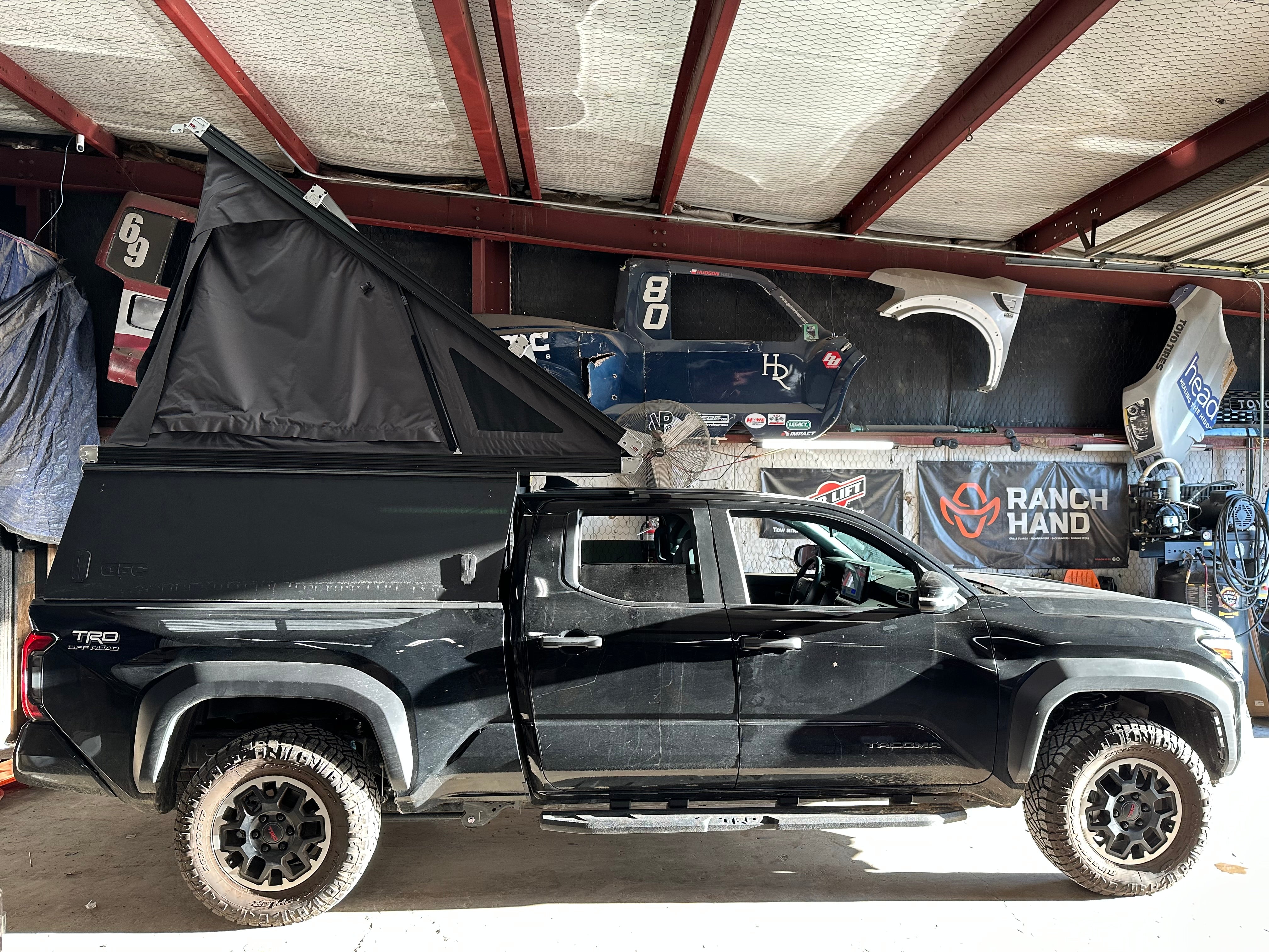 This 2023 Toyota Tacoma is outfitted with a GFC Platform Camper with Black panels and a Stone Grey tent. Check out more build specs below.