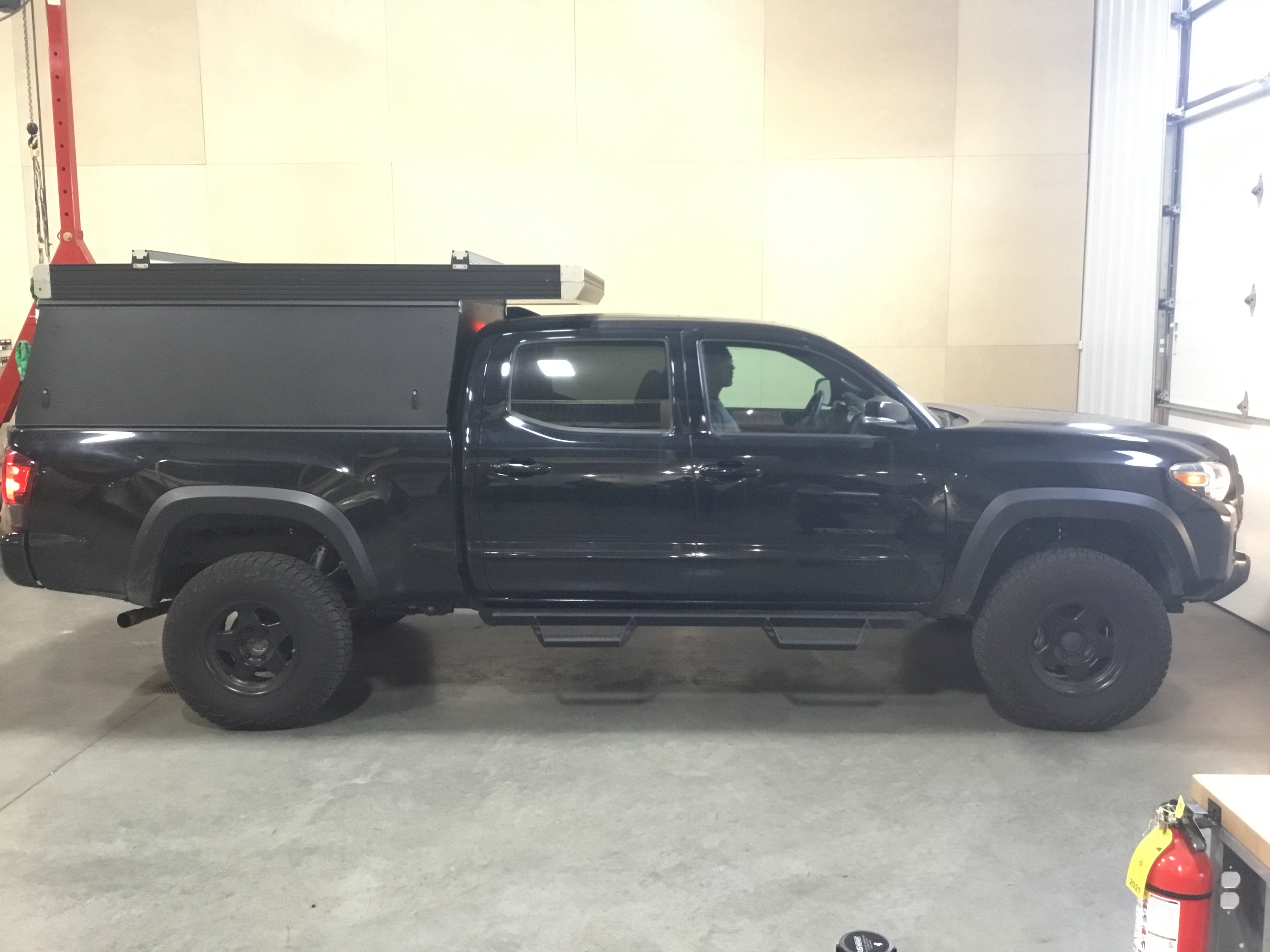 Product: Platform Camper Panel Color: Black GFC Options: Windows, Side Door, Beef Rack Year: 2019 Make: Toyota Model: Tacoma Cab/Bed: Double Cab 6 Foot Truck Color Black Wheels: SCS Suspension: Bilstein, Icon Tire: Falken Wildpeak AT 265/75/R16 Mods: All I need is a GFC Instagram Handle:@pfoulger Install Date: 2021-11-18 Location: California