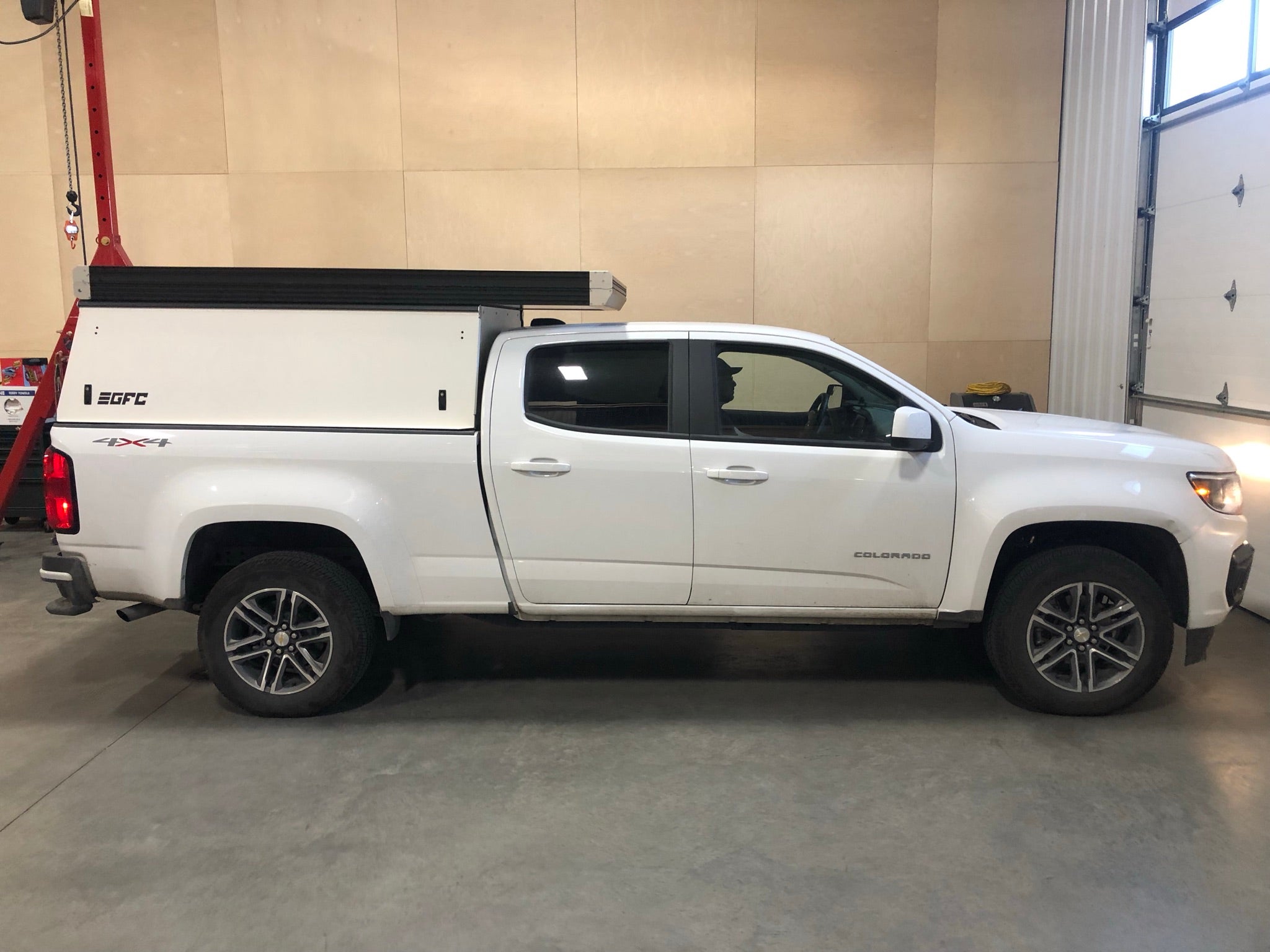 This 2021 Chevrolet Colorado is outfitted with a GFC Platform Camper with White panels. Check out more build specs below.