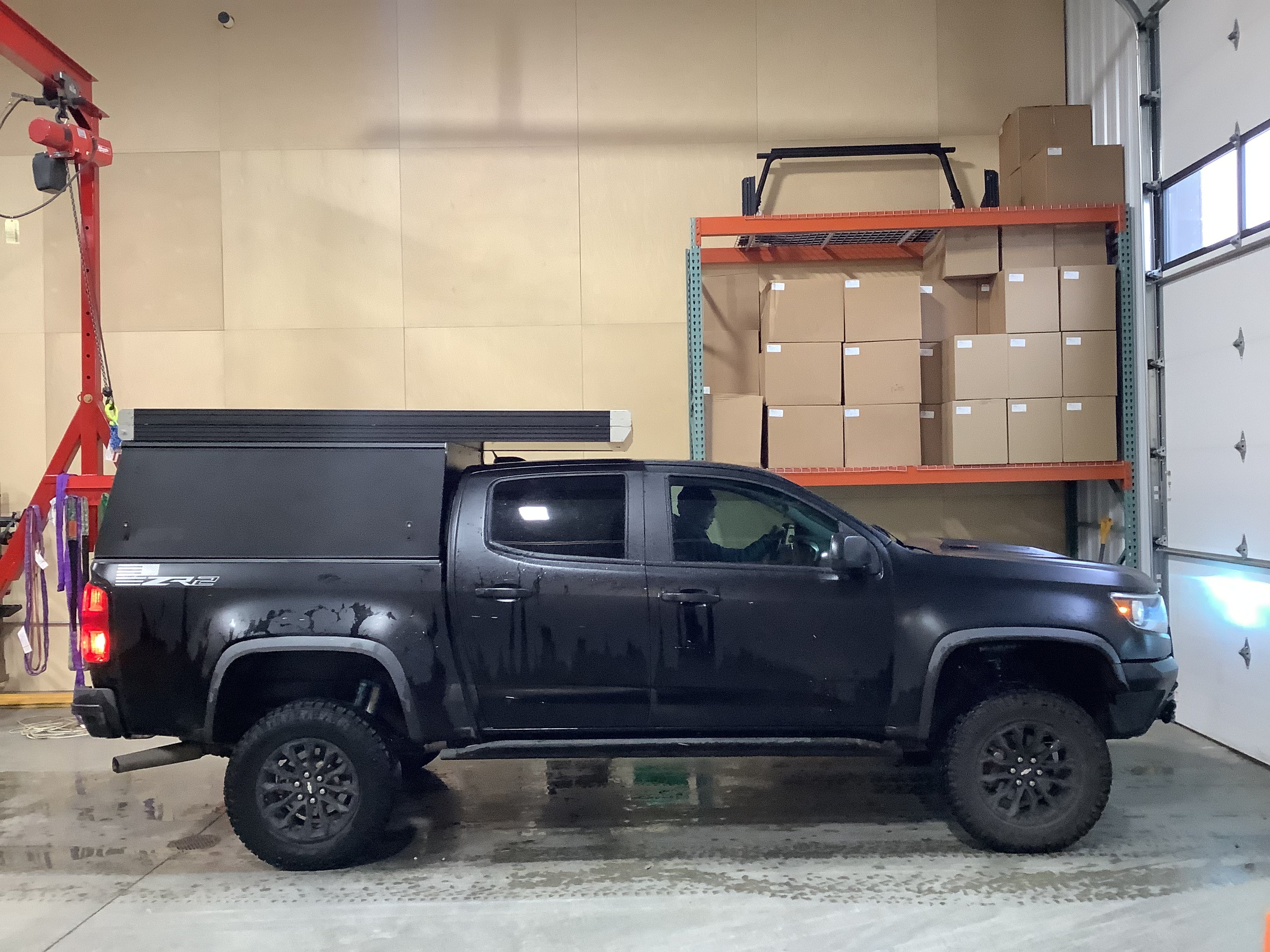 Product: Platform Camper Panel Color: Black GFC Options: Windows, Side Door Year: 2019 Make: Chevrolet Model: Colorado Cab/Bed: Double Cab 5 foot Truck Color Black Wheels: Stock Suspension: King Tire: Goodyear Duratrac 265/75/R16 Mods: All I need is a GFC Instagram Handle: None Install Date: 2022-04-23 Location: Washington