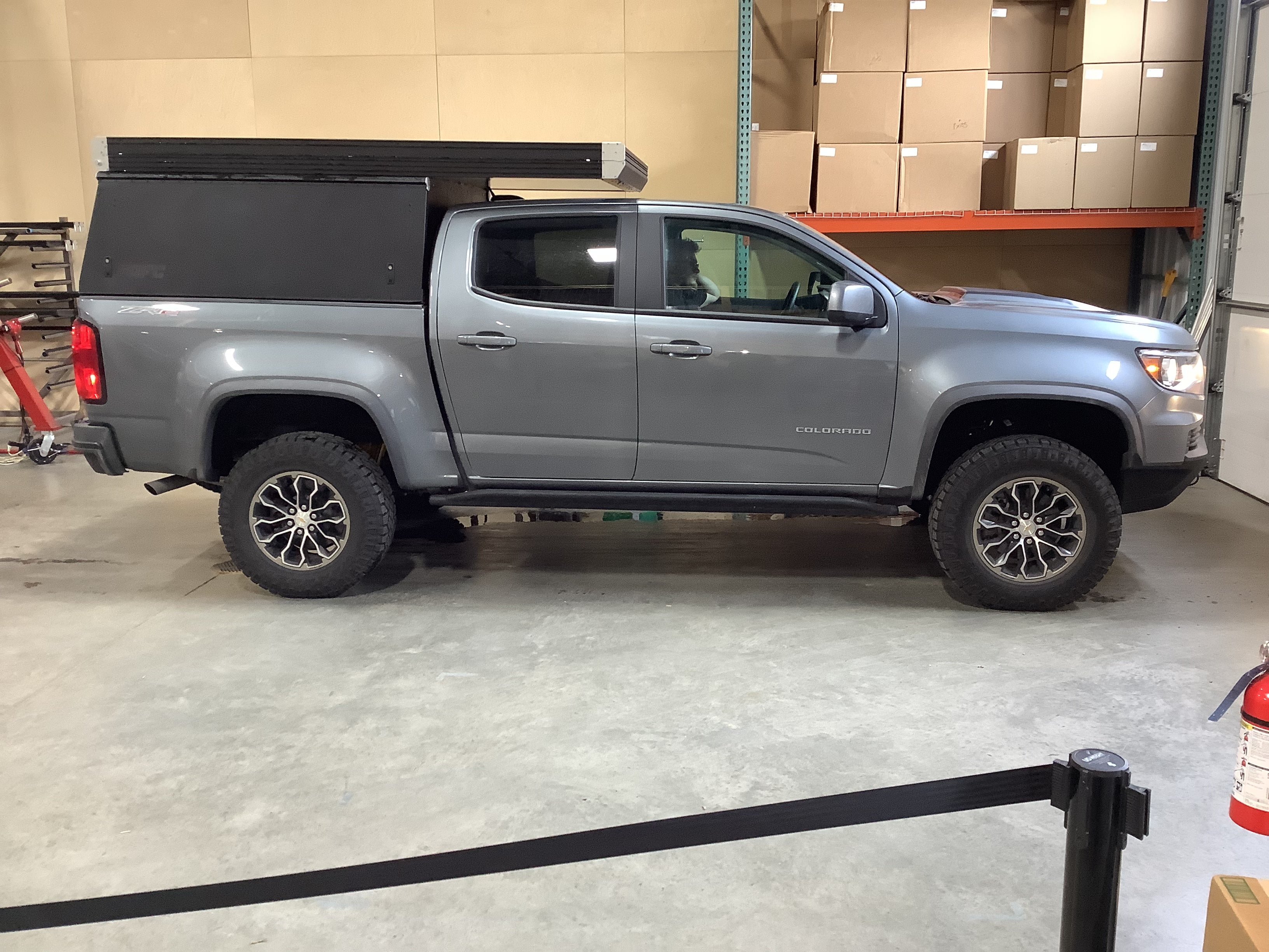 This 2022 Chevrolet Colorado is outfitted with a GFC Platform Camper with Black panels. Check out more build specs below.