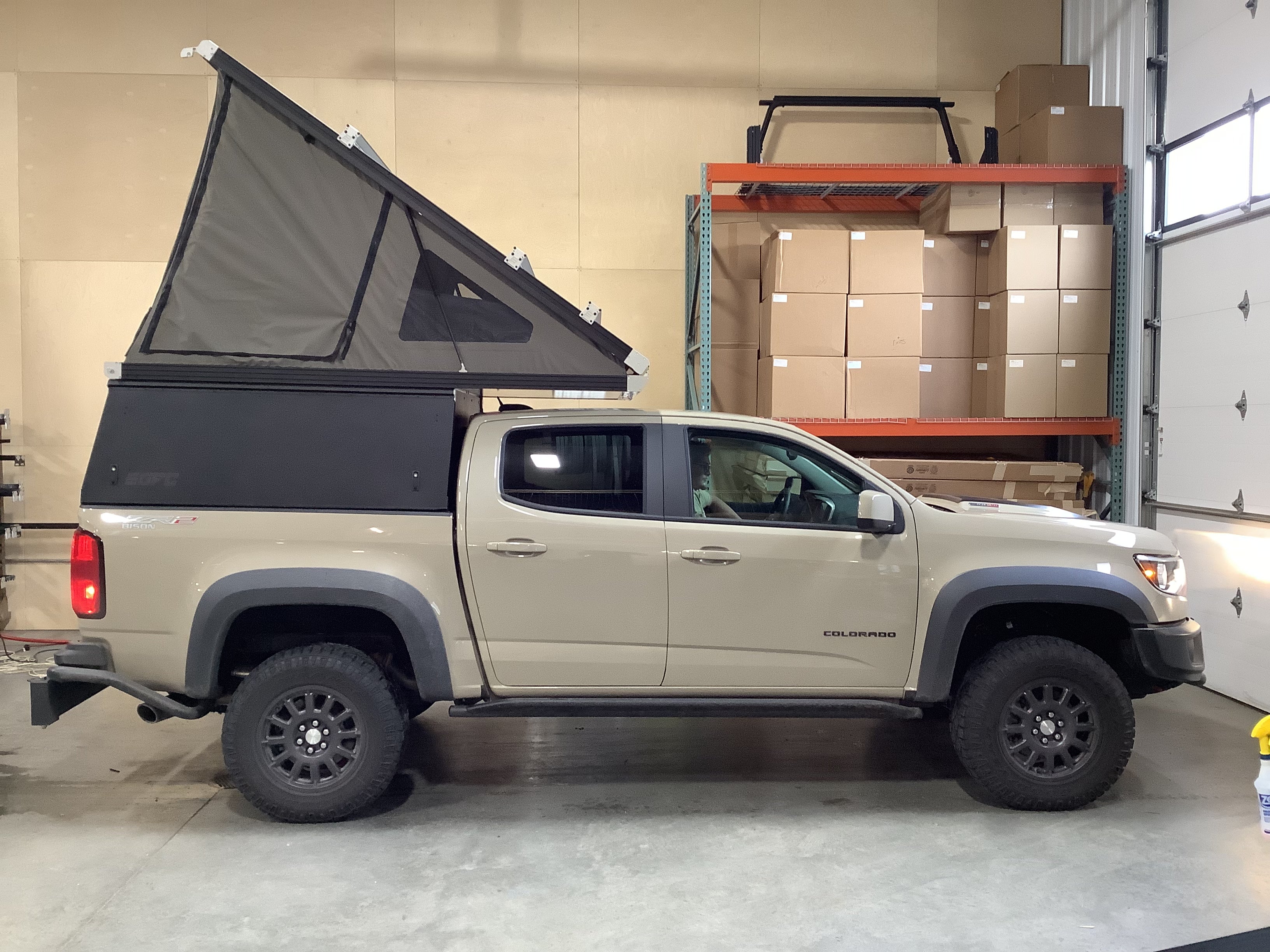This 2022 Chevrolet Colorado is outfitted with a GFC Platform Camper with Black panels. Check out more build specs below.