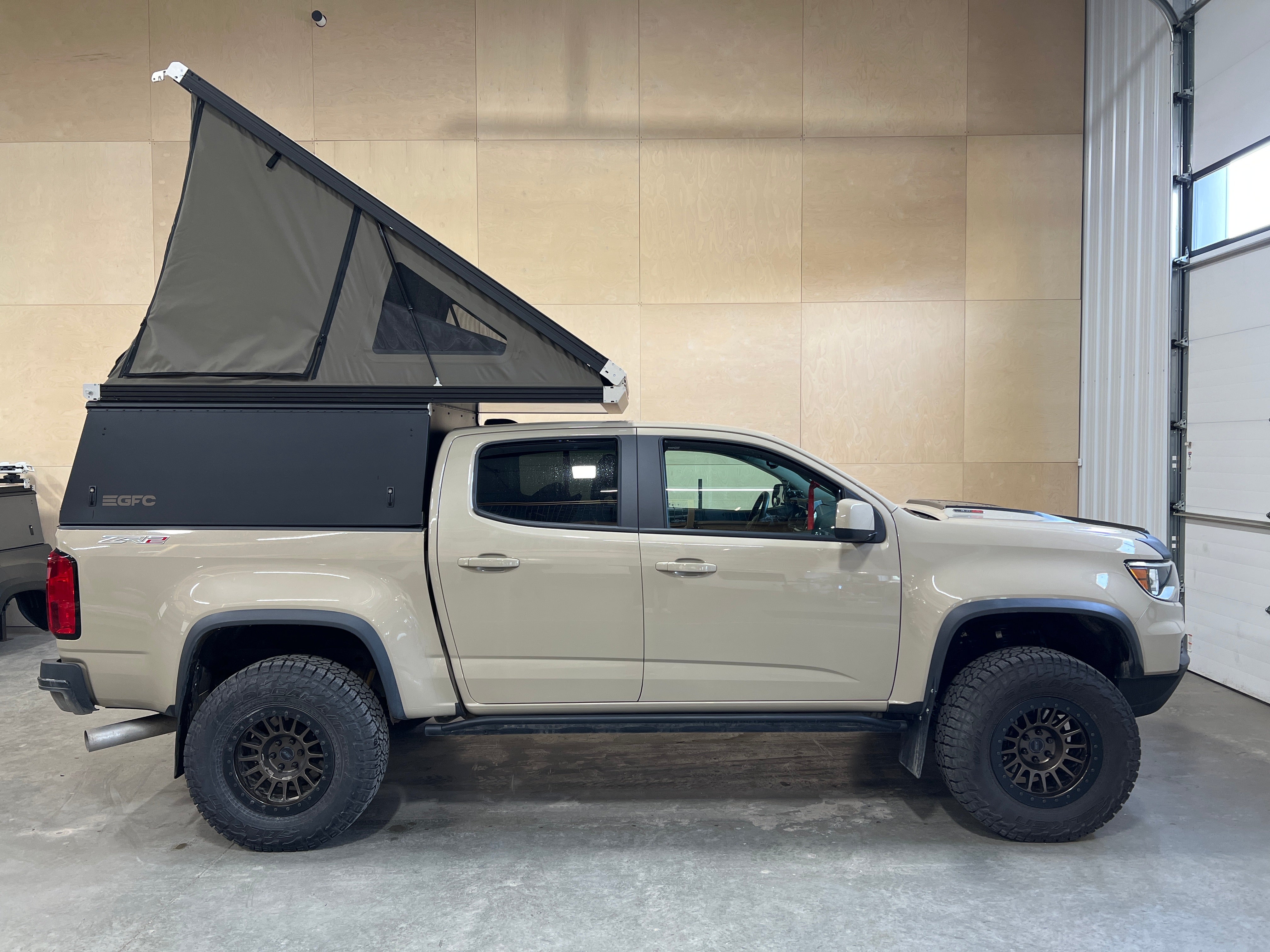 This 2022 Chevrolet Colorado is outfitted with a GFC Platform Camper with Black panels. Check out more build specs below.
