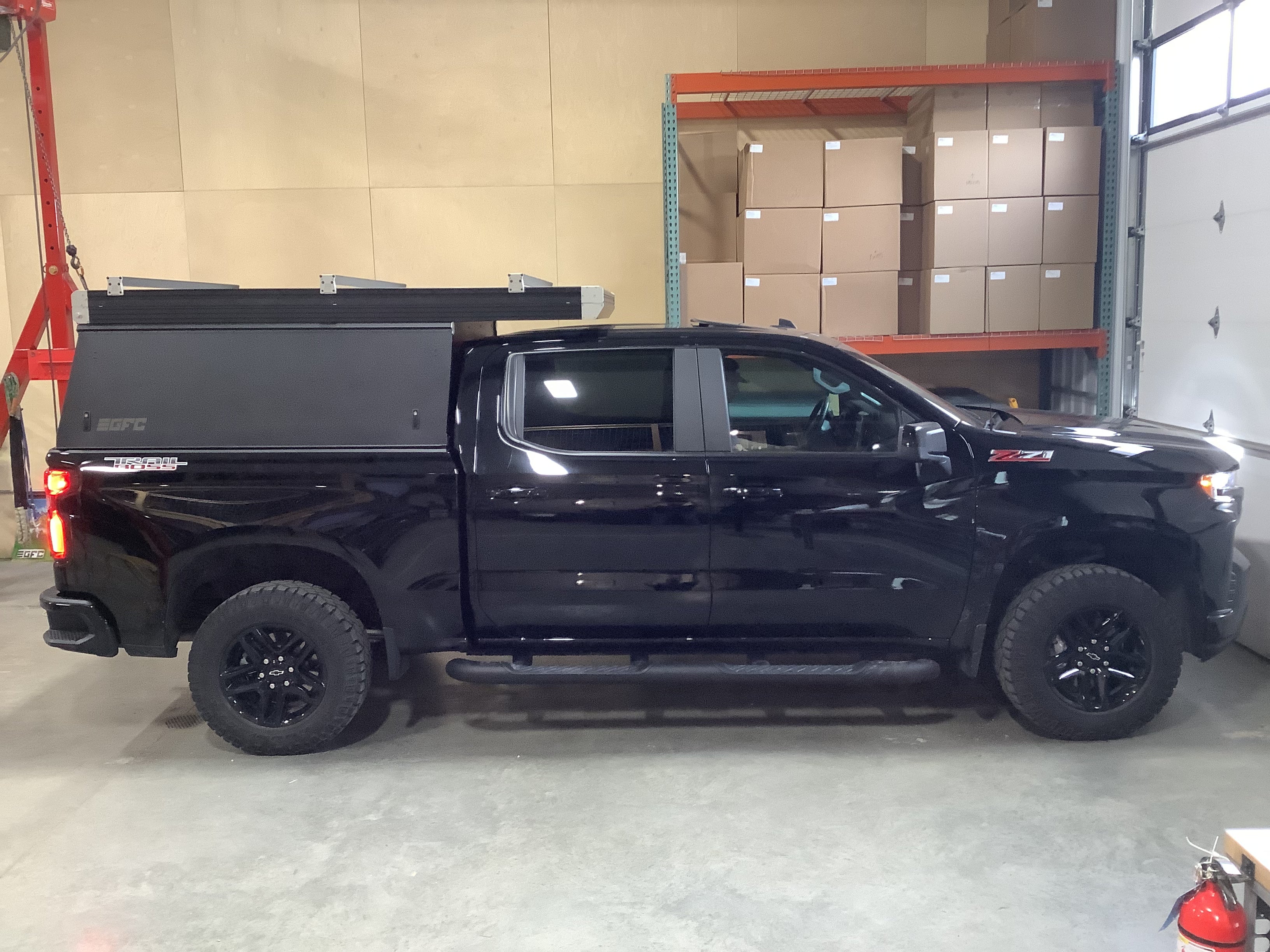 Product: Platform Camper Panel Color: Black GFC Options: Beef Rack, Side Door, Windows Year: 2020 Make: Chevrolet Model: Silverado Cab/Bed: Double Cab 5 foot Truck Color Black Wheels: Stock Suspension: Stock Tire: Goodyear Duratrac 275/65/R18 Mods: All I need is a GFC Instagram Handle:None Install Date: 2022-03-24 Location: Montana