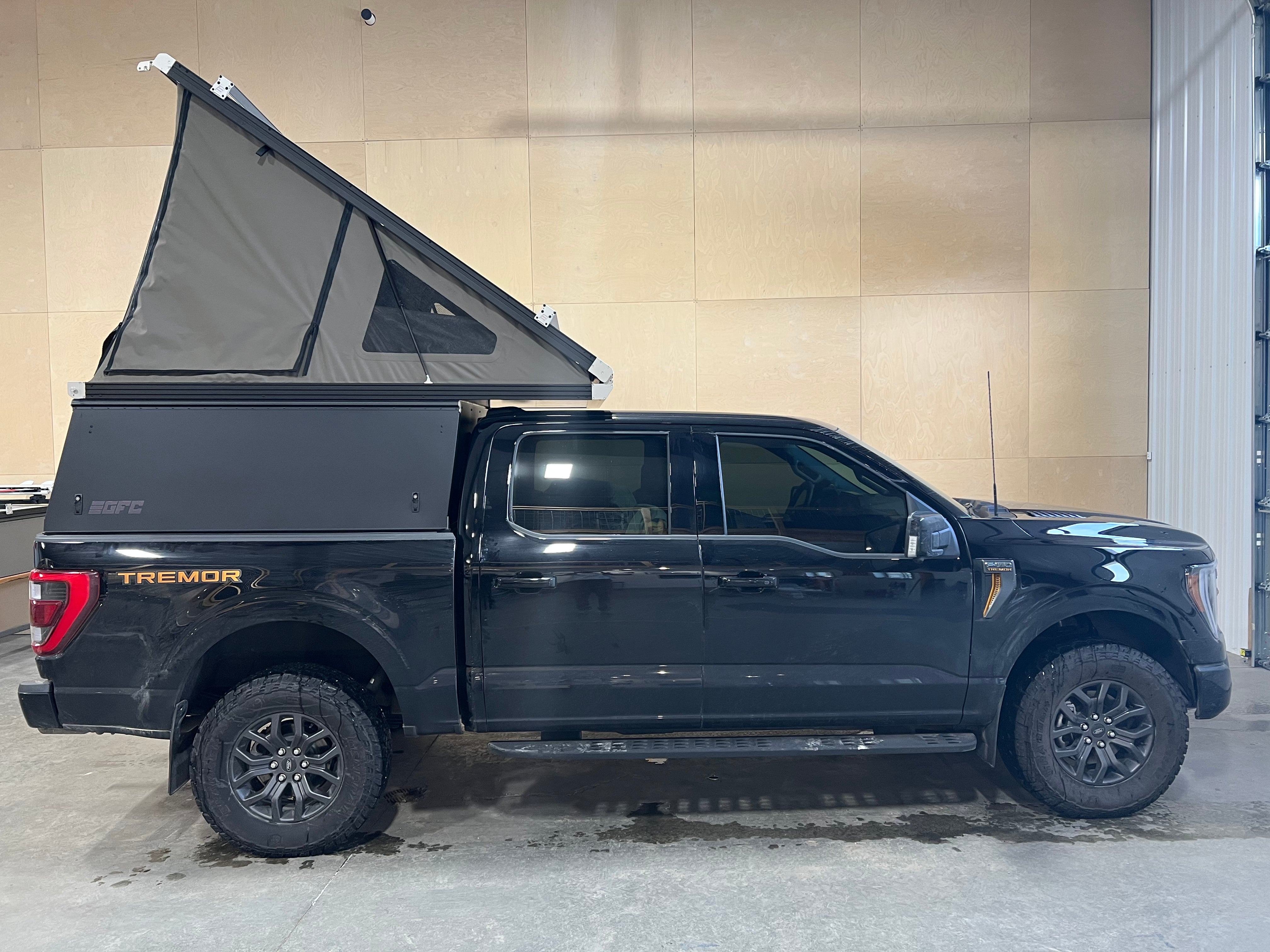 Product: Platform Camper Panel Color: Black GFC Options: Windows, Side Door, Beef Rack Year: 2022 Make: Ford Model: F150 Cab/Bed: Crew Cab 5 foot Truck Color Black Wheels: Stock Suspension: Stock Tire: General Grabber 275/70/r18 Mods: All I need is a GFC Instagram Handle: Install Date: 2022-12-11 Location: Idaho