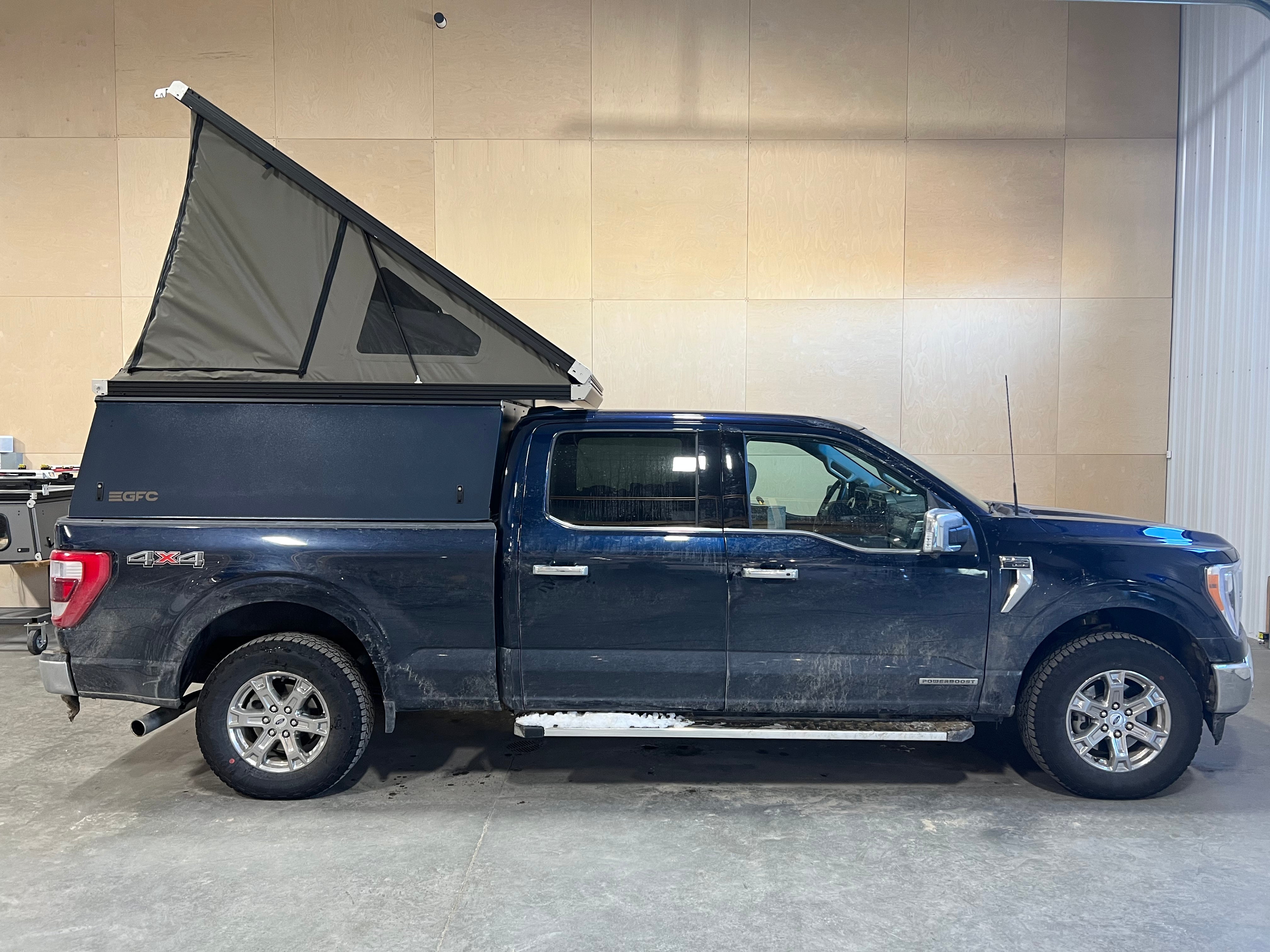 This 2023 Ford F150 is outfitted with a GFC Platform Camper with Destroyer Blue panels. Check out more build specs below.
