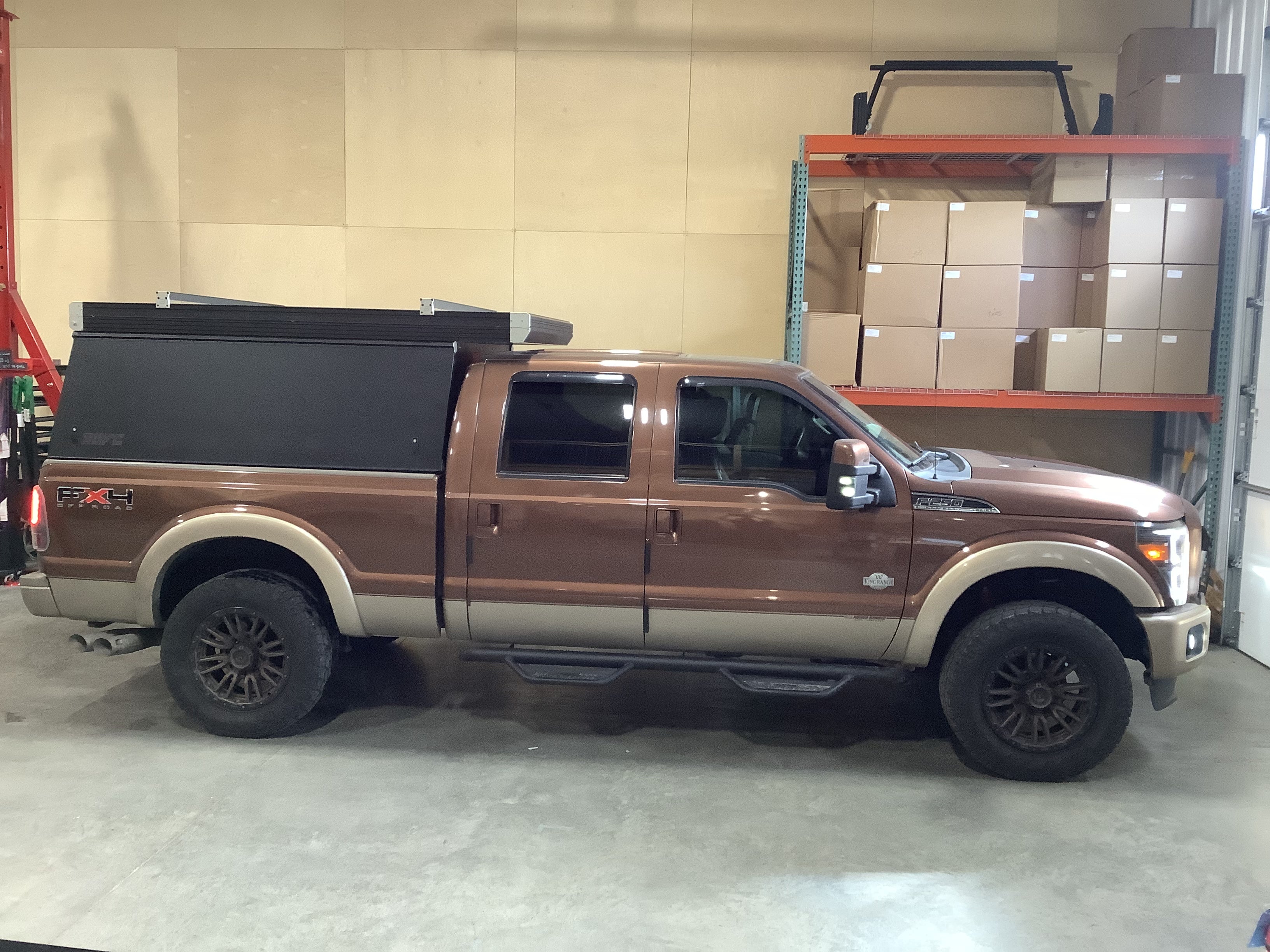 Product: Platform Camper Panel Color: Black GFC Options: Windows, Side Door, Beef Rack Year: 2011 Make: Ford Model: F250 Cab/Bed: Double Cab 6 Foot Truck Color Brown Wheels: Fuel Suspension: Stock Tire: Toyo Open Country Extreme 35/12.5/R20 Mods: All I need is a GFC Instagram Handle: @jjan99oo Install Date: 2022-05-21 Location: California