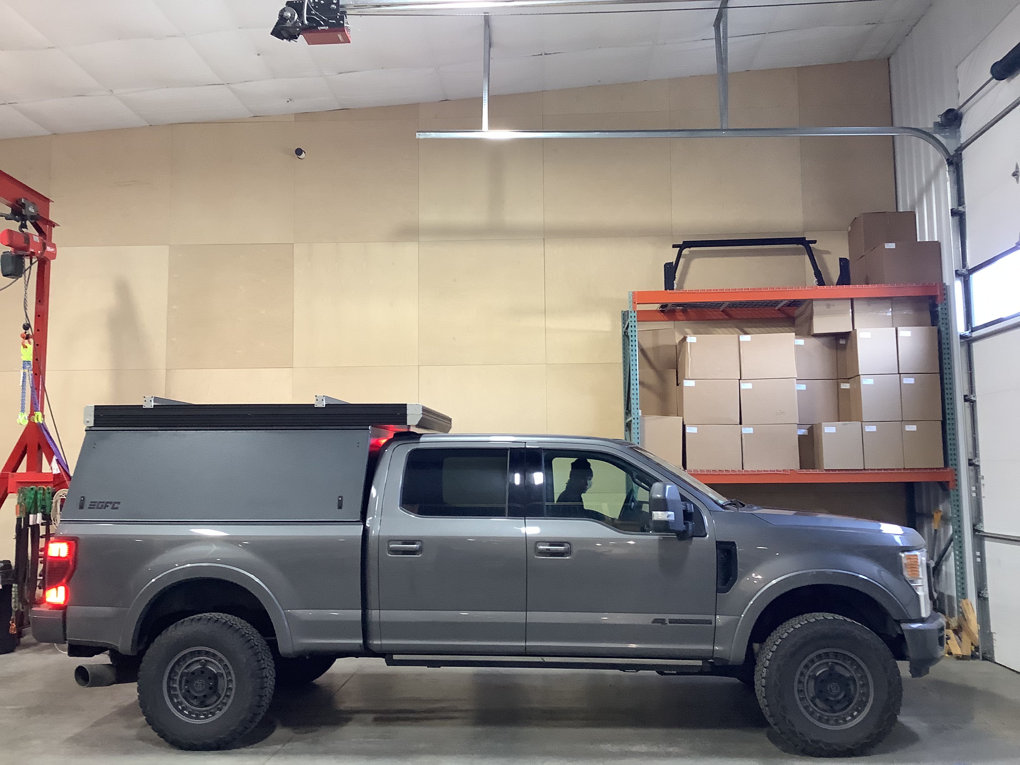 This 2022 Ford F250 is outfitted with a GFC Platform Camper with Battleship Gray panels. Check out more build specs below.