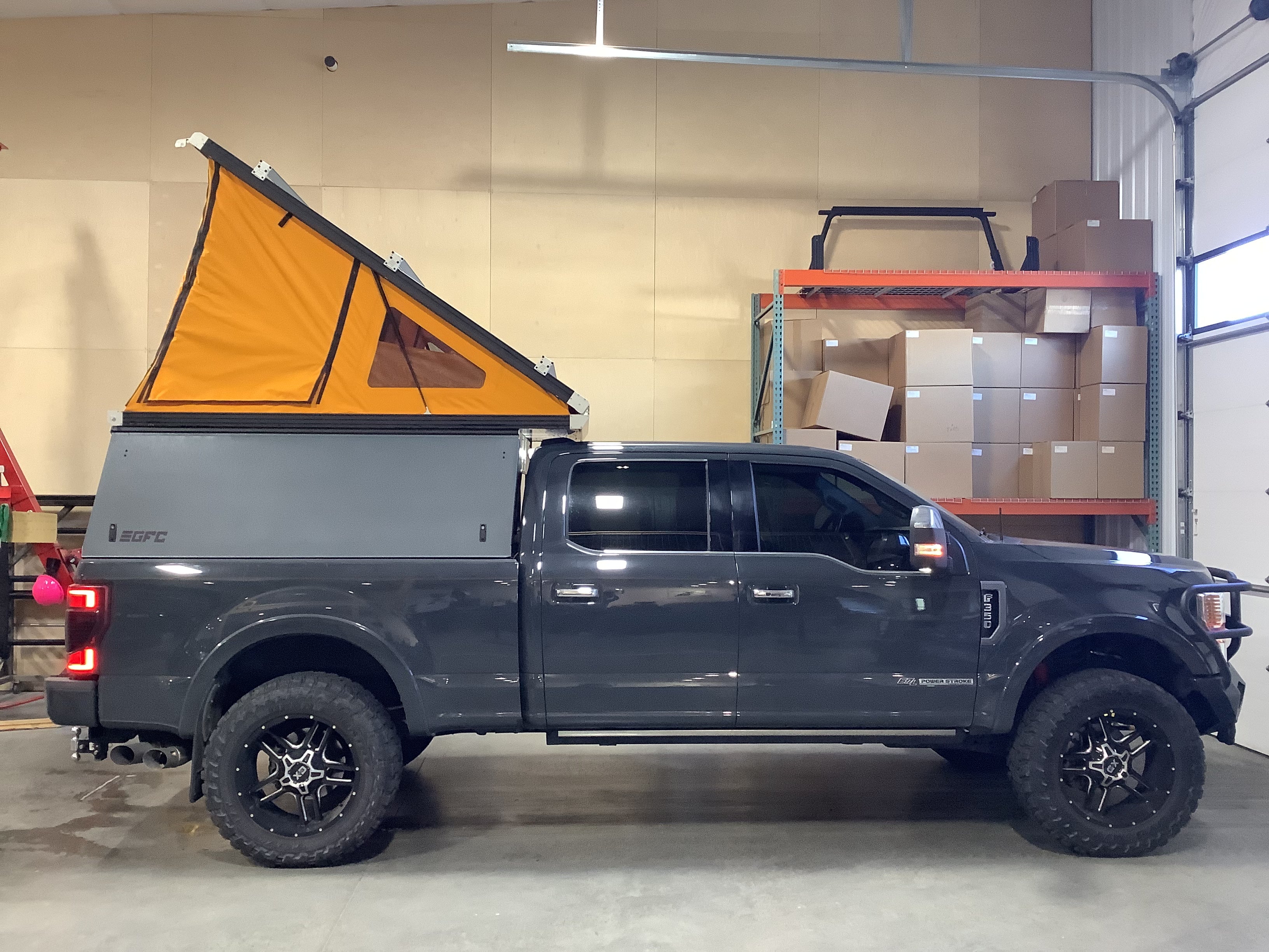 This 2021 Ford F350 is outfitted with a GFC Platform Camper with Black panels. Check out more build specs below.