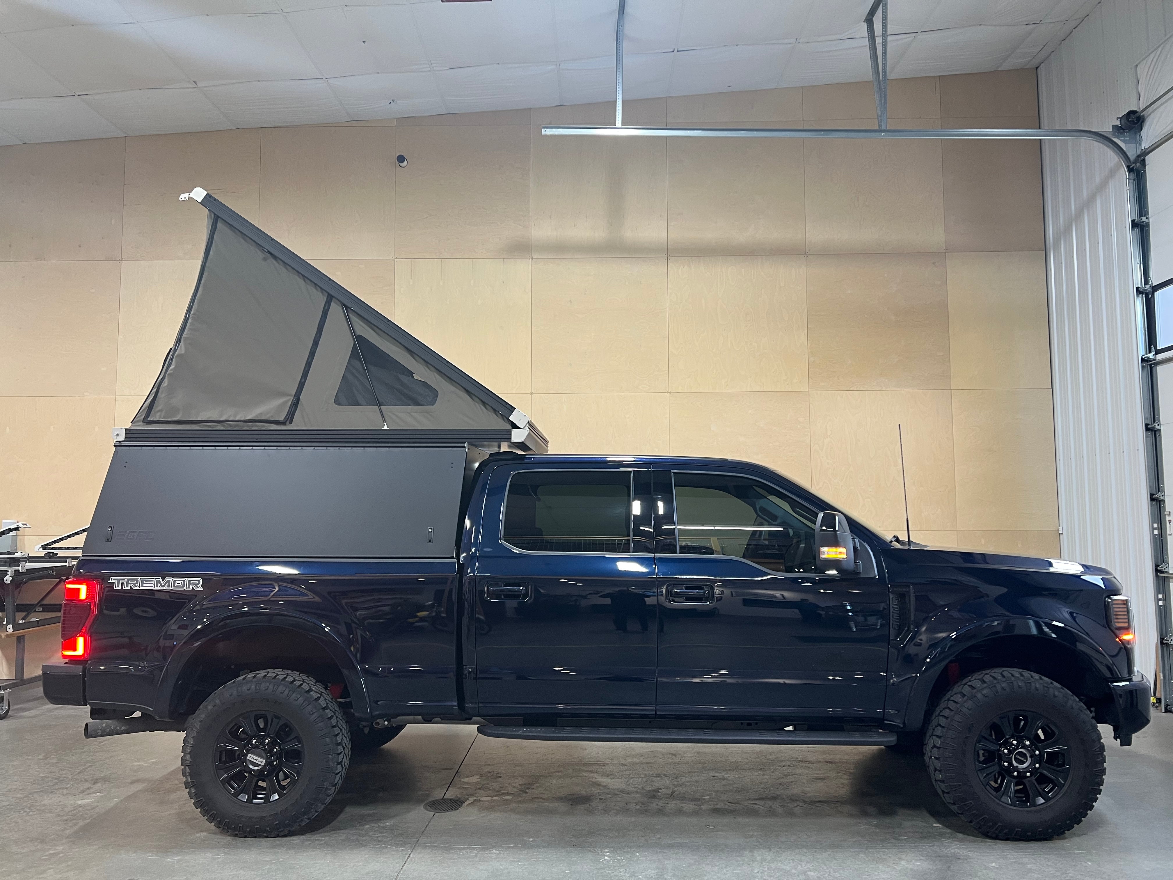This 2022 Ford F350 is outfitted with a GFC Platform Camper with Black panels. Check out more build specs below.