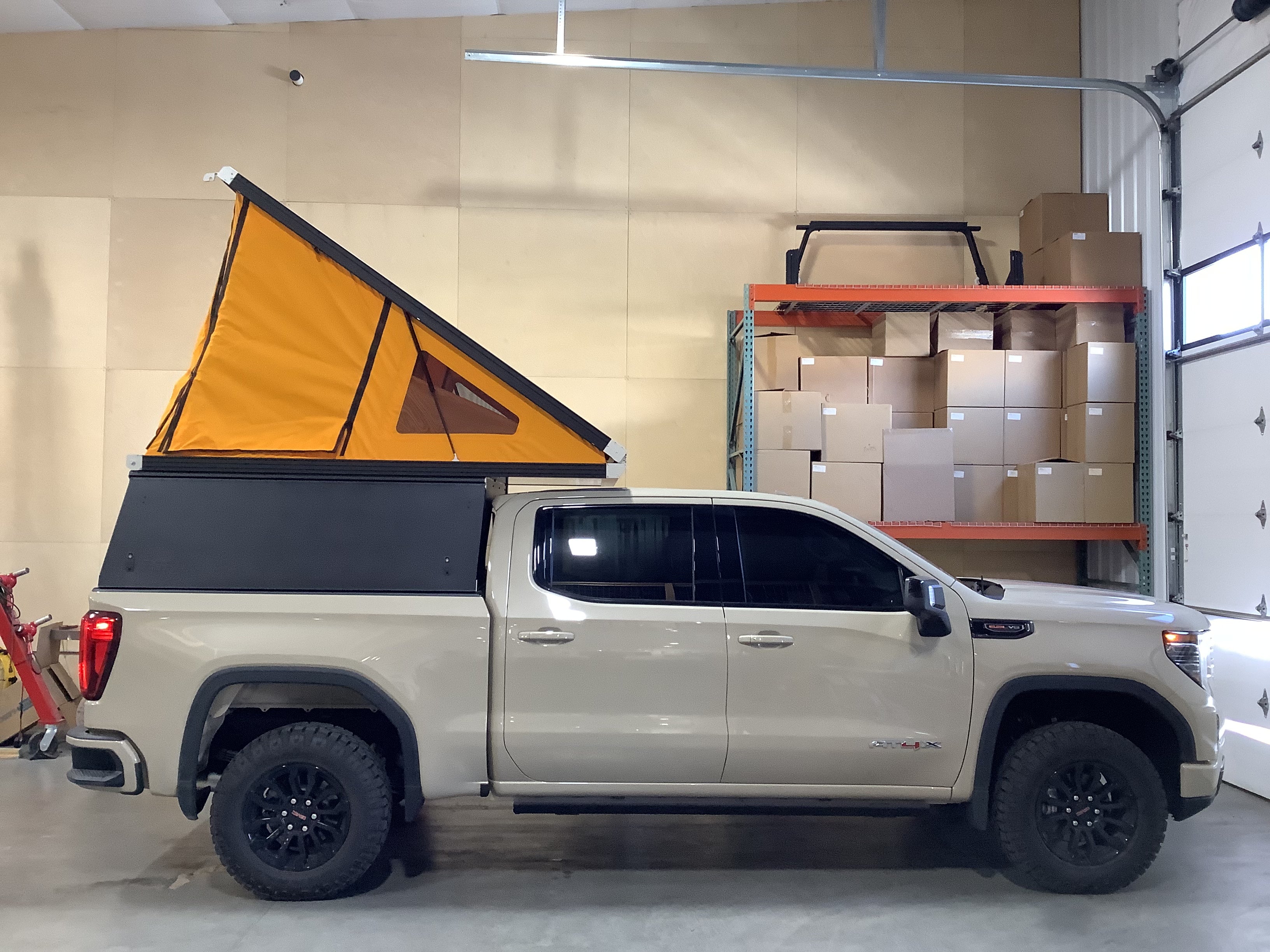 Product: Platform Camper Panel Color: Black GFC Options: Windows, Side Door Year: 2022 Make: GMC Model: Sierra Cab/Bed: Crew Cab 5 foot Truck Color Tan Wheels: Stock Suspension: Stock Tire: Goodyear Wrangler 275/65/R18 Mods: All I need is a GFC Instagram Handle: Install Date: 2022-08-26 Location: CA