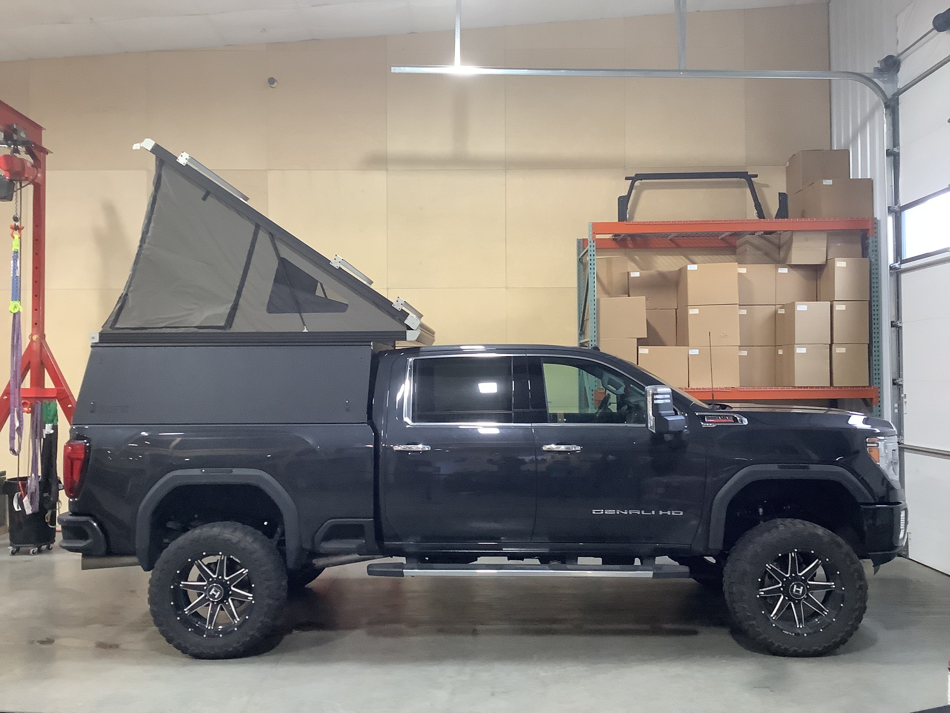 Product: Platform Camper Panel Color: Black GFC Options: Beef Rack, Windows, Side Door Year: 2020 Make: GMC Model: Sierra Cab/Bed: Crew Cab 6 Foot Truck Color Black Wheels: Suspension: Fox Tire: Toyo Open Country 37x13.5xR22 Mods: All I need is a GFC Instagram Handle: Install Date: 2022-08-05 Location: Utah