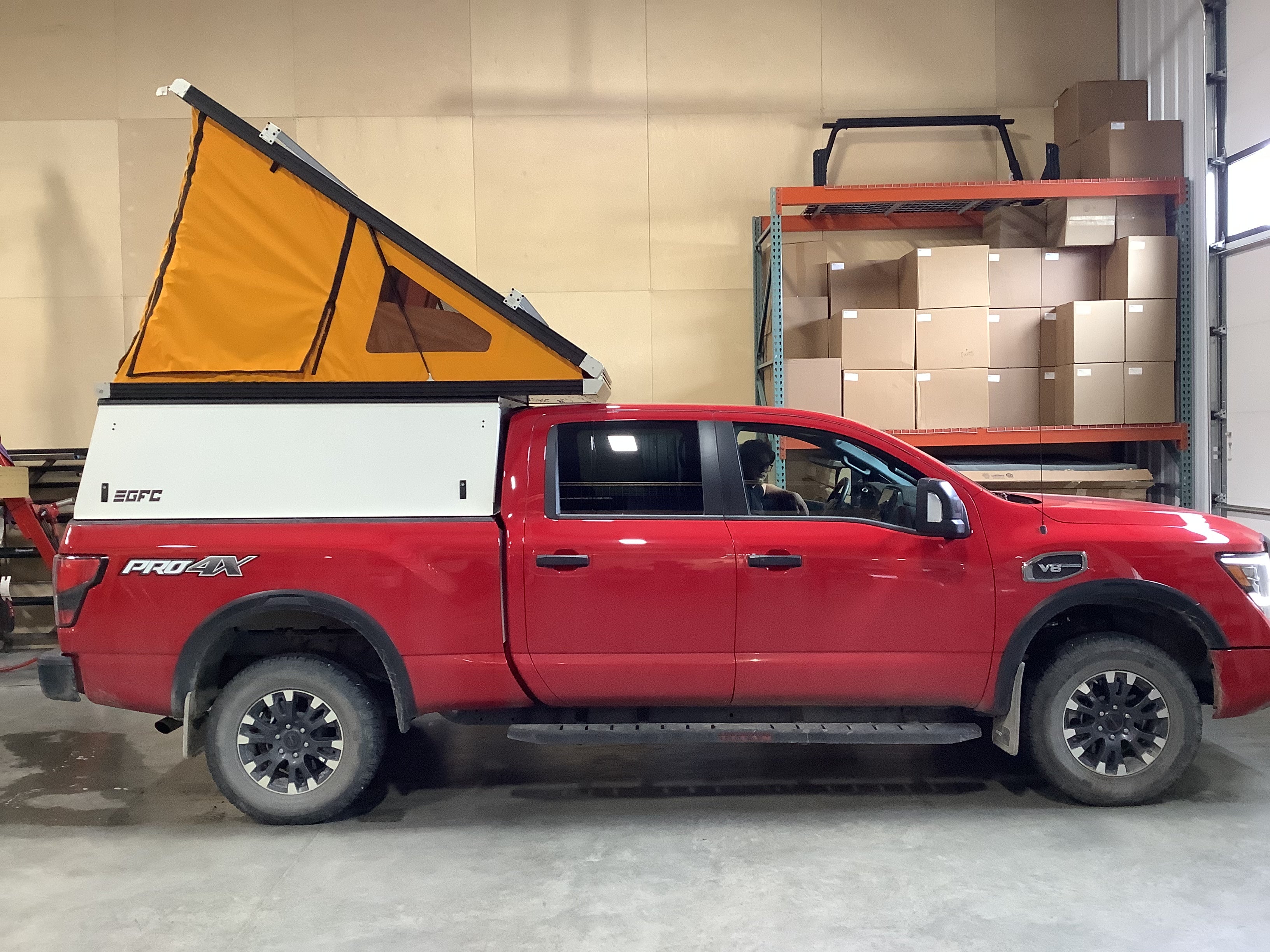 Product: Platform Camper Panel Color: White GFC Options: Windows, Side Door, Beef Rack Year: 2021 Make: Nissan Model: Titan Cab/Bed: Double Cab 6 Foot Truck Color Red Wheels: Stock Suspension: Stock Tire: General Grabber APT 275/65/R18 Mods: All I need is a GFC Instagram Handle:None Install Date: 2022-06-11 Location: Montana