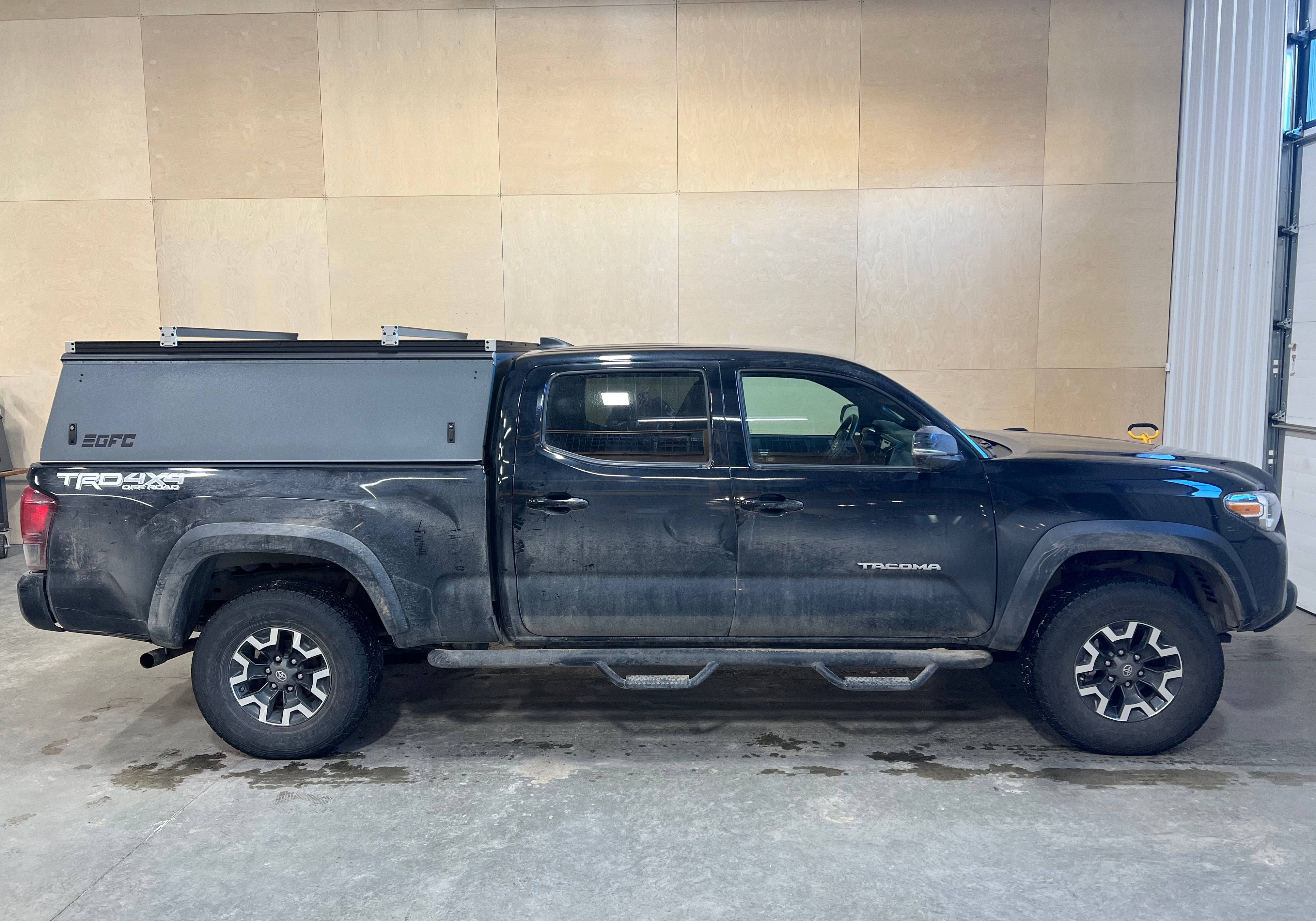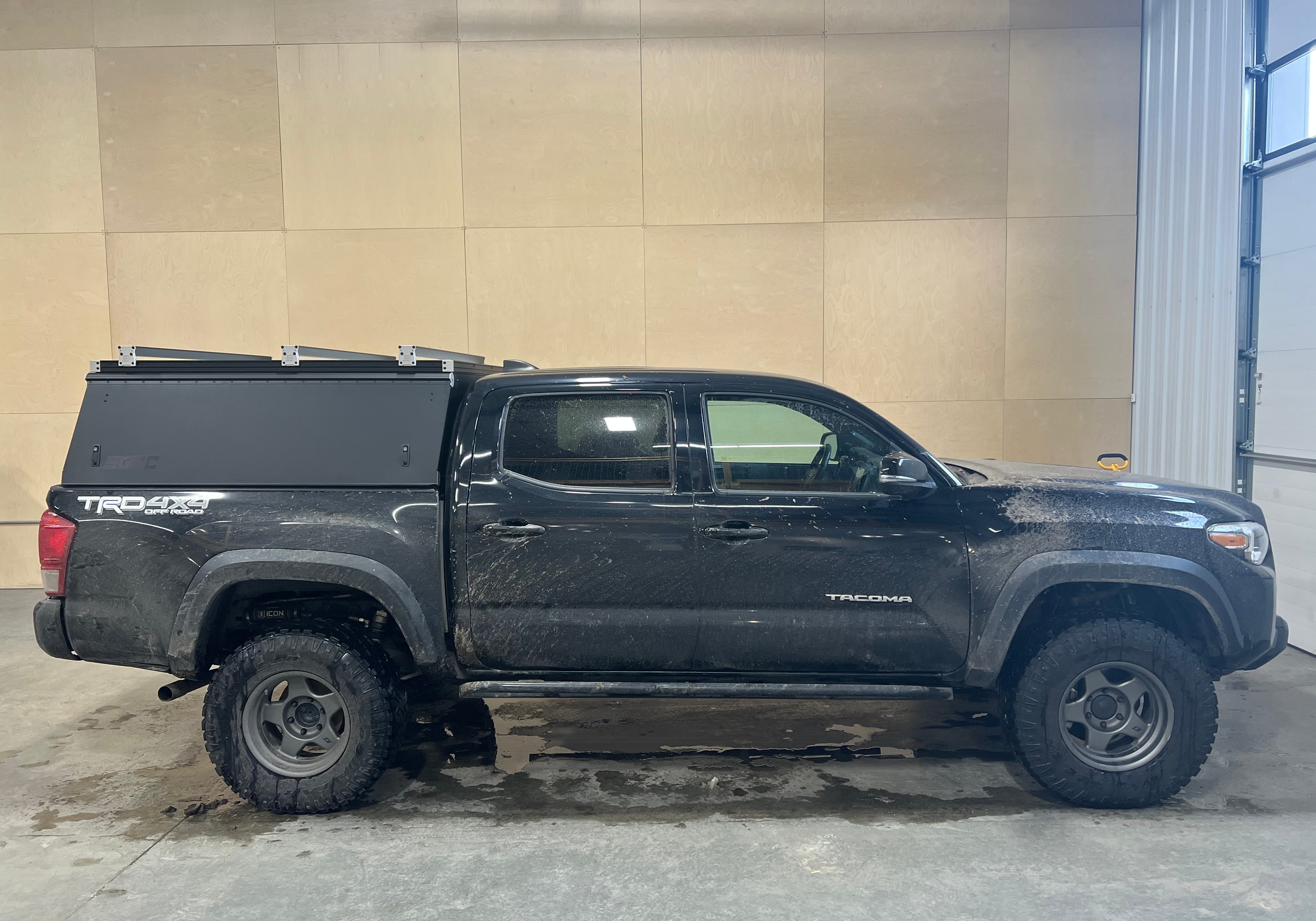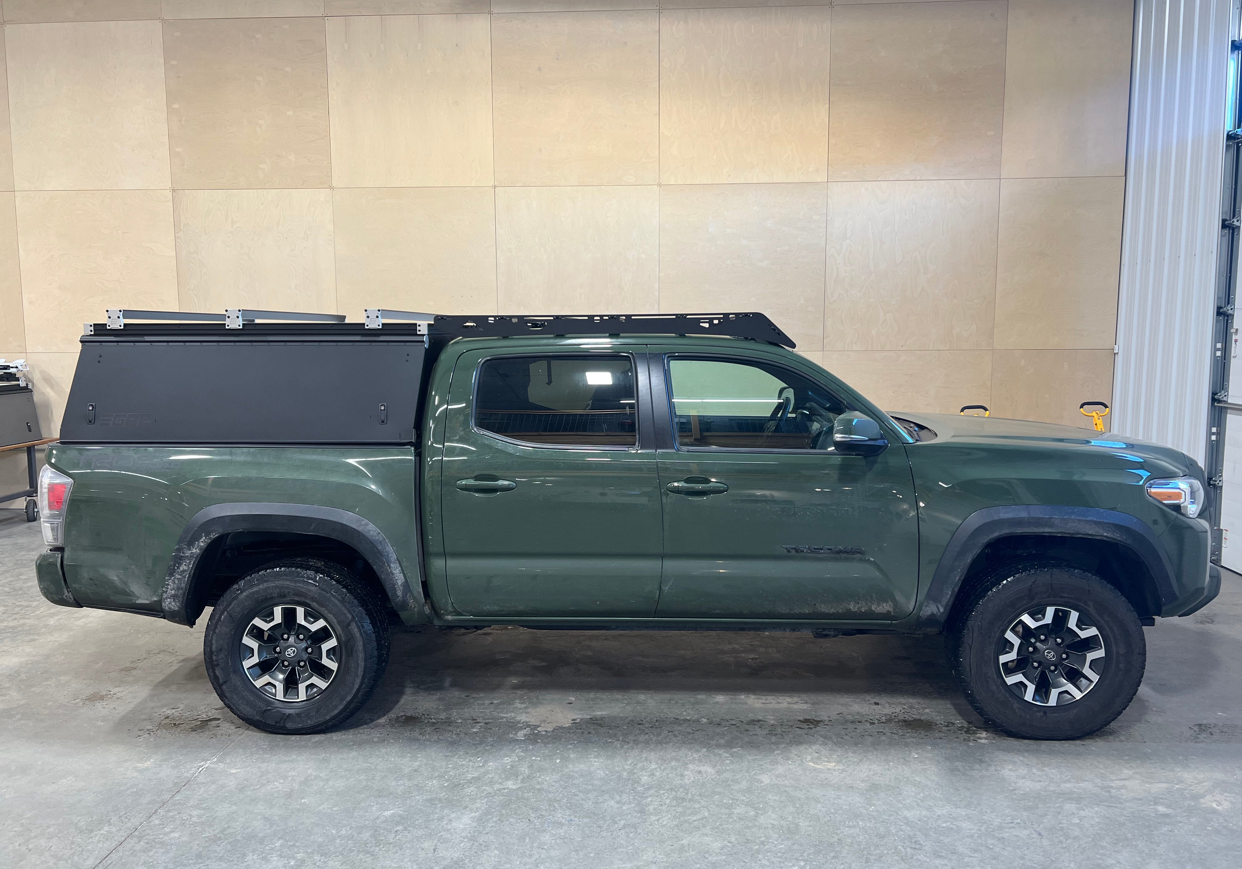 Product: Topper Panel Color: Black GFC Options: Beef Rack Year: 2021 Make: Toyota Model:Tacoma Cab/Bed: Double Cab 5 foot Truck Color Green Wheels: Stock Suspension: Stock Tire: Goodyear Wrangler 265/70/r16...