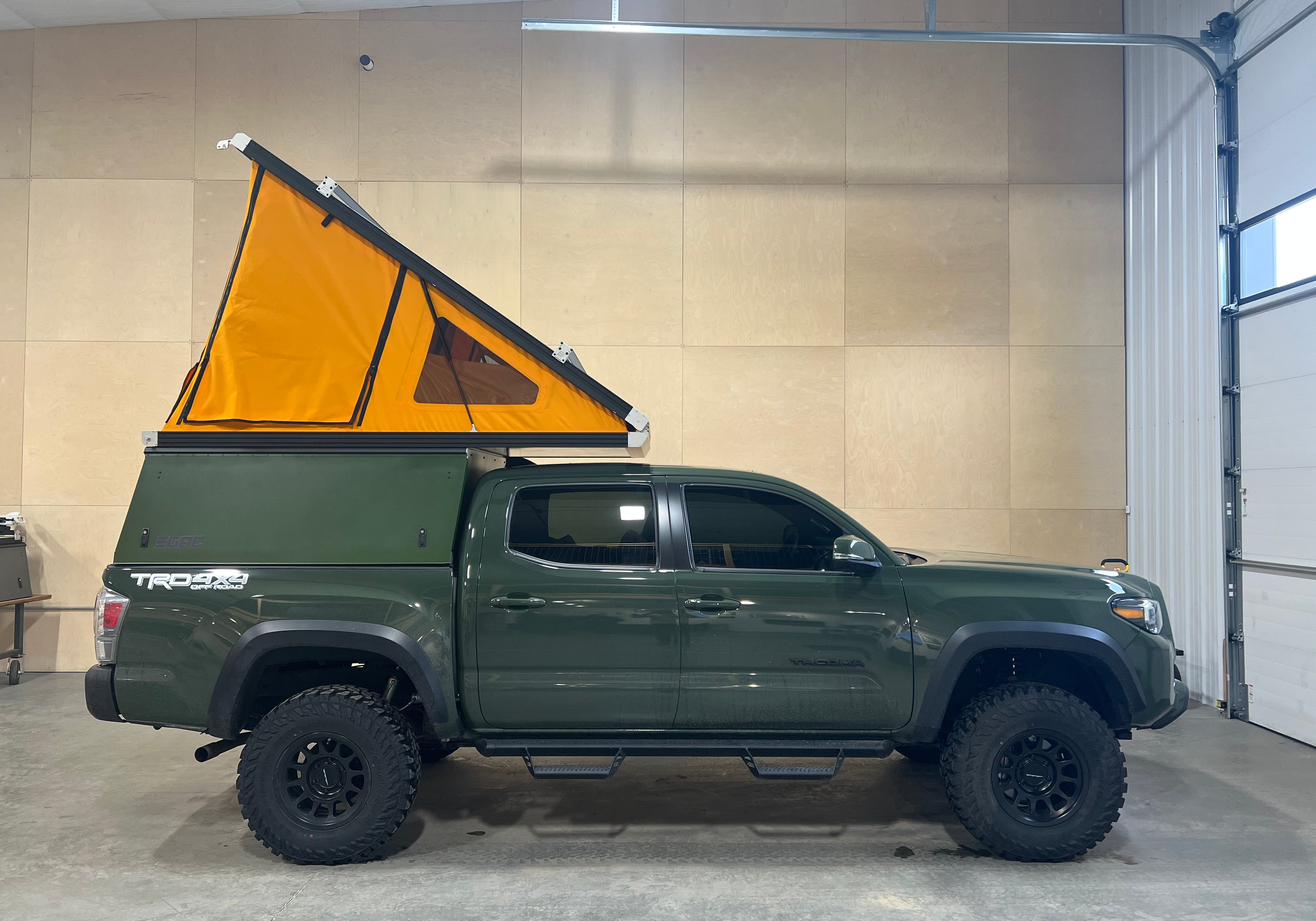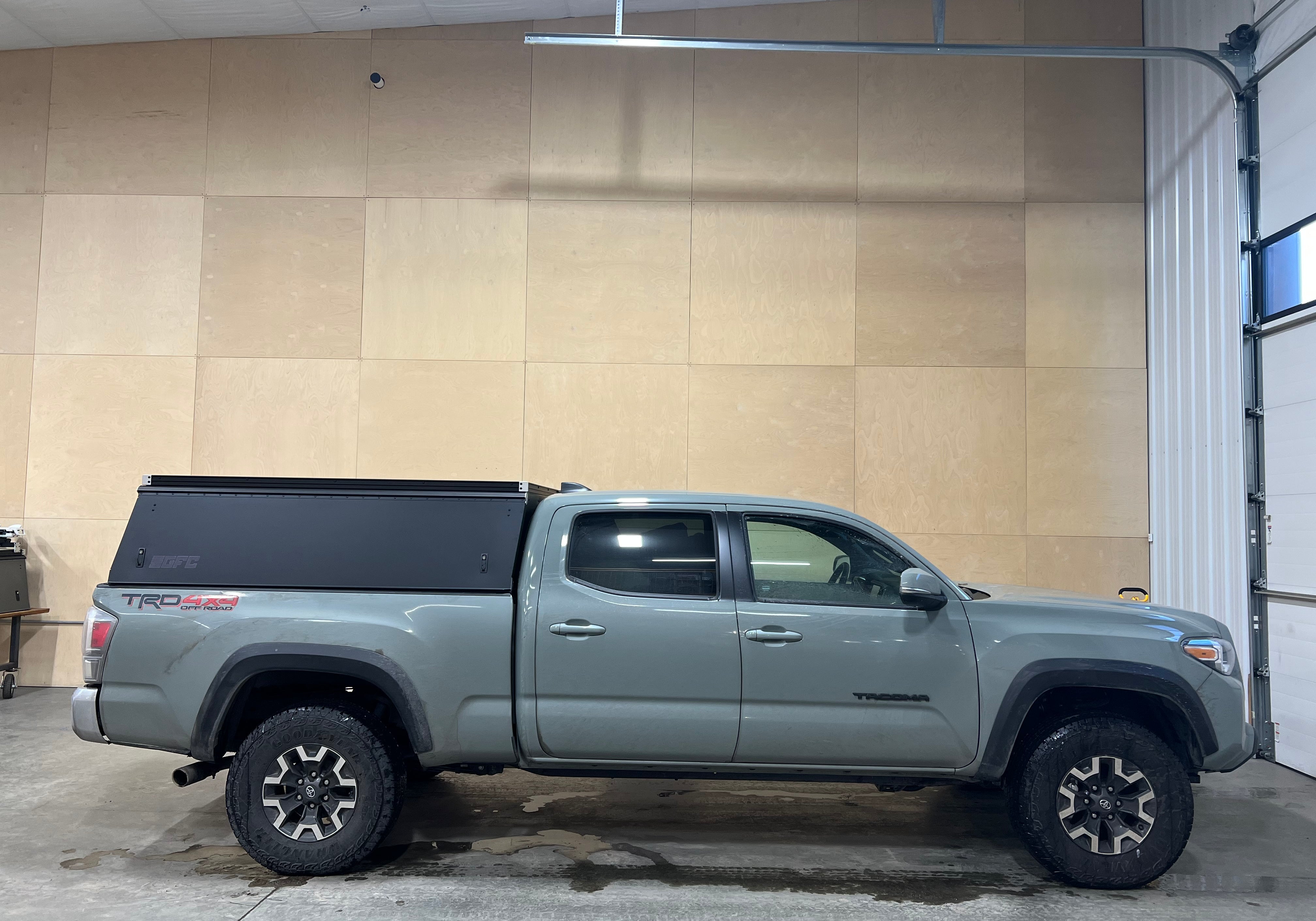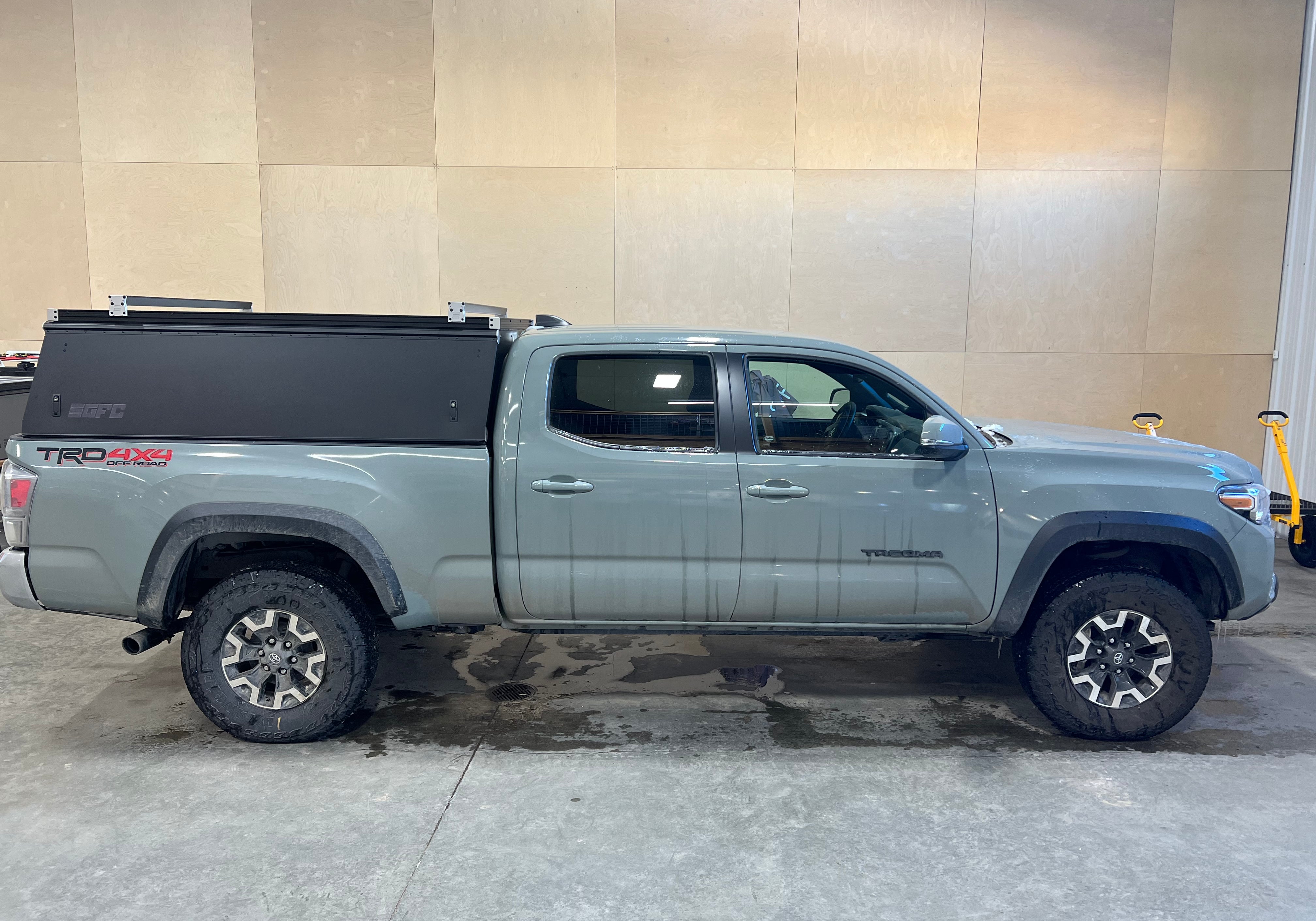 Product: Topper Panel Color: Black GFC Options: Beef Rack Year: 2021 Make: Toyota Model:Tacoma Cab/Bed: Double Cab 5 foot Truck Color Green Wheels: Stock Suspension: Stock Tire: Goodyear Wrangler 265/70/r16...