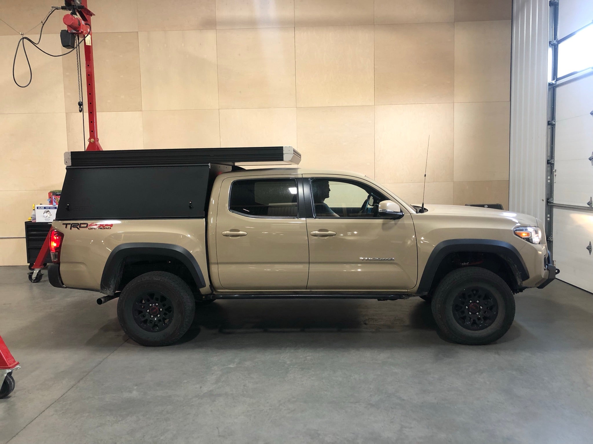 Product: Platform Camper Panel Color: Black GFC Options: Windows Year: 2019 Make: Toyota Model: Tacoma Cab/Bed: Double Cab 5 foot Truck Color Tan Wheels: Stock Suspension: Stock Tire: Michelin Defender 265/70/R16 Mods: All I need is a GFC Instagram Handle:None Install Date: 2021-08-06 Location: Michigan