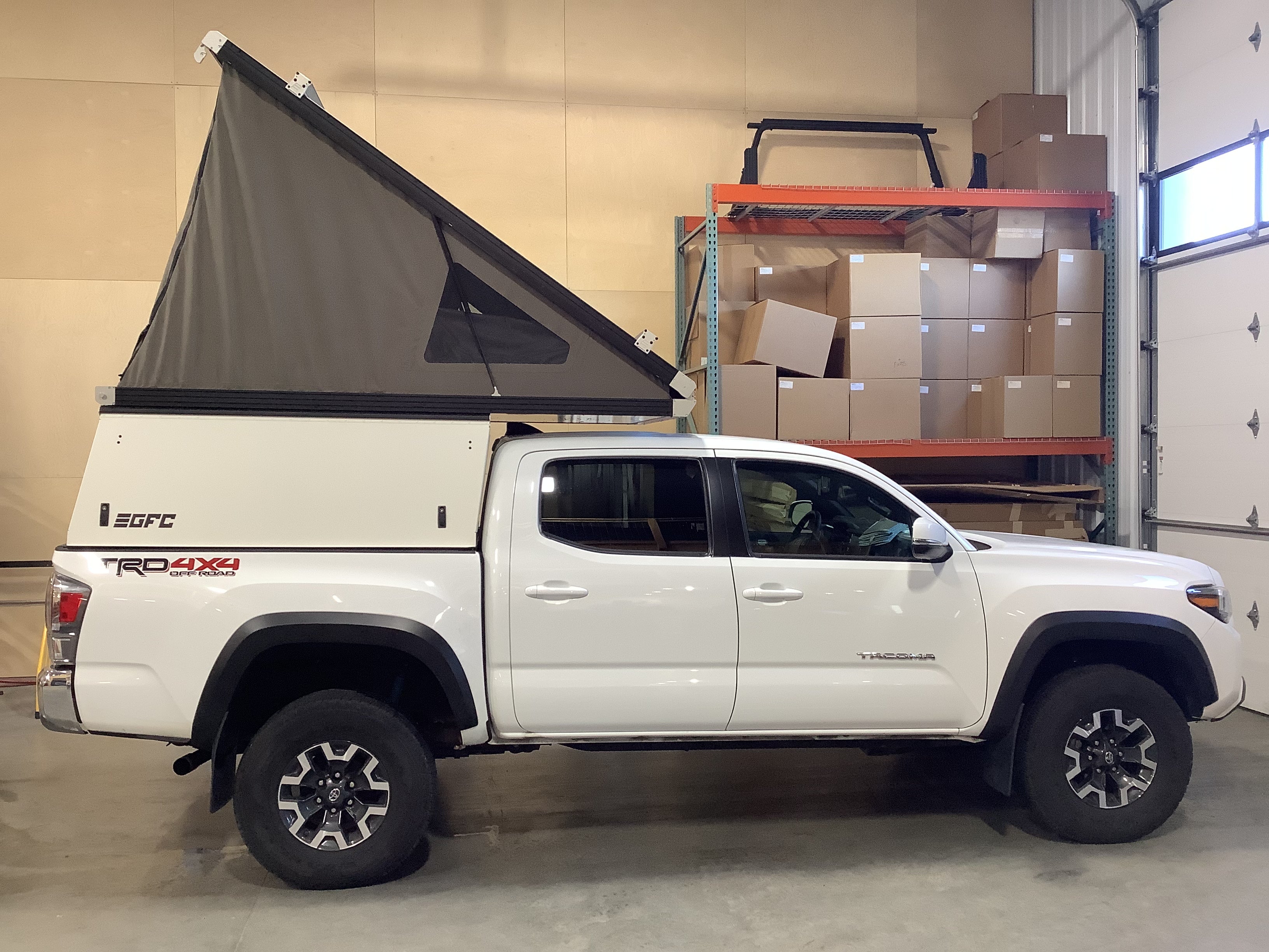 Product: Platform Camper Panel Color: White GFC Options: Windows Year: 2021 Make: Toyota Model: Tacoma Cab/Bed: Quad Cab 5 foot Truck Color White Wheels: Stock Suspension: Bilstein Tire: Goodyear Wrangler 265/70/r16 Mods: All I need is a GFC Instagram Handle: Install Date: 2022-06-23 Location: VA