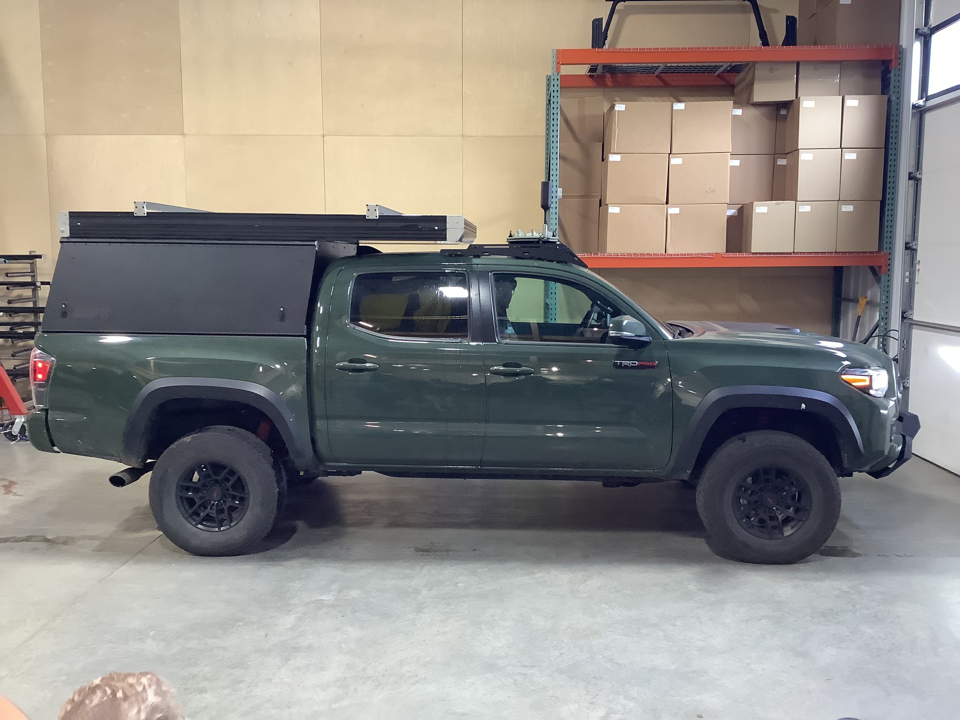 Product: Platform Camper Panel Color: Black GFC Options: Windows, Side Door, Beef Rack Year: 2020 Make: Toyota Model: Tacoma Cab/Bed: Double Cab 5 foot Truck Color Green Wheels: Stock Suspension: Old Man Emu/ARB Tire: Michelin Defender 265/75/R16 Mods: All I need is a GFC Instagram Handle:None Install Date: 2022-06-02 Location: Illinois