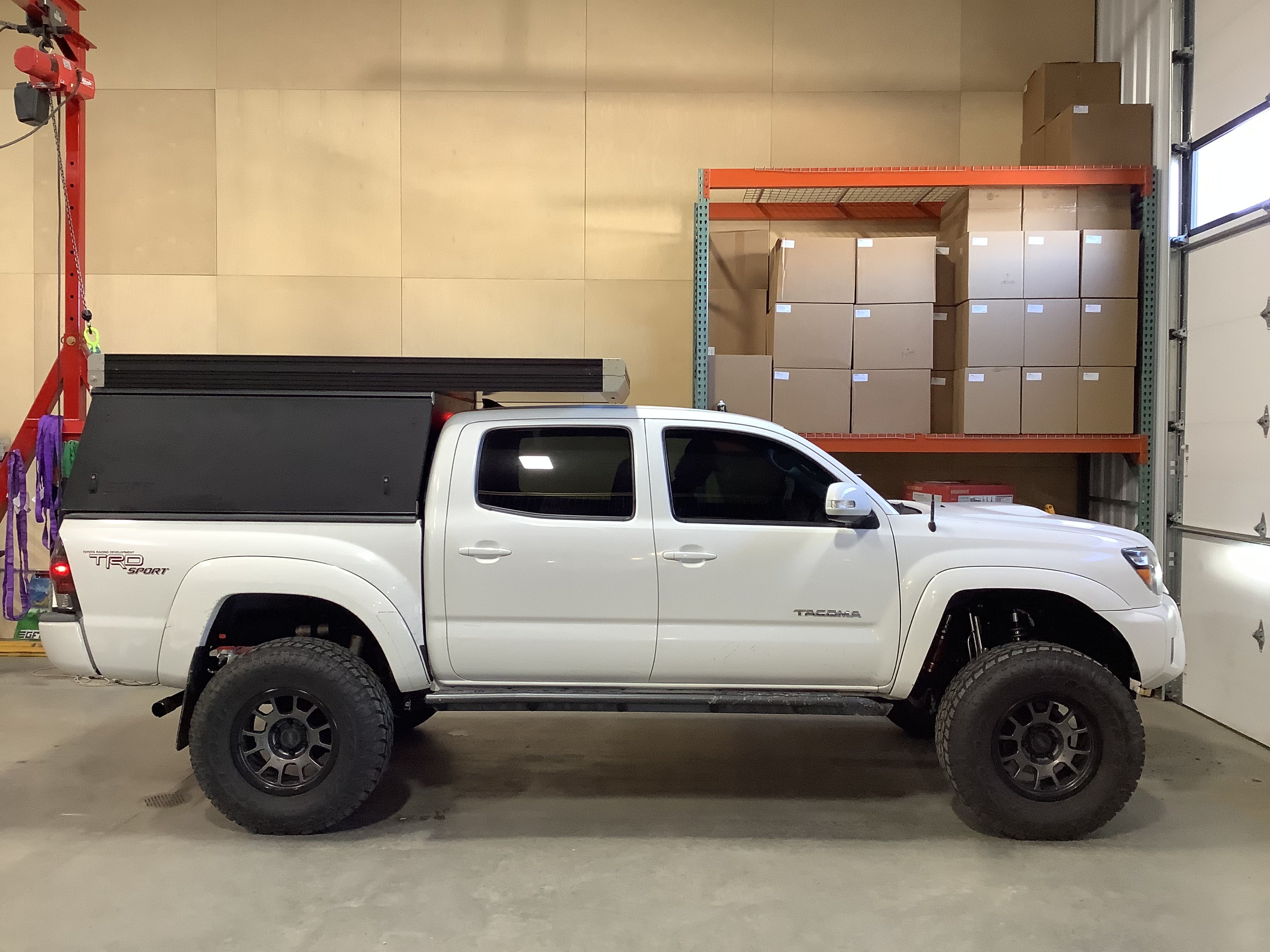 Product: Platform Camper Panel Color: Black GFC Options: Windows, Side Door Year: 2015 Make: Toyota Model: Tacoma Cab/Bed: Double Cab 5 foot Truck Color White Wheels: Race Relation Wheels Suspension: Fox, Old Man Emu/ARB Tire: Toyo Open Country AT 285/75/R17 Mods: C4 Fabrication Armor Instagram Handle: @trail4r Install Date: 2022-04-02 Location: California