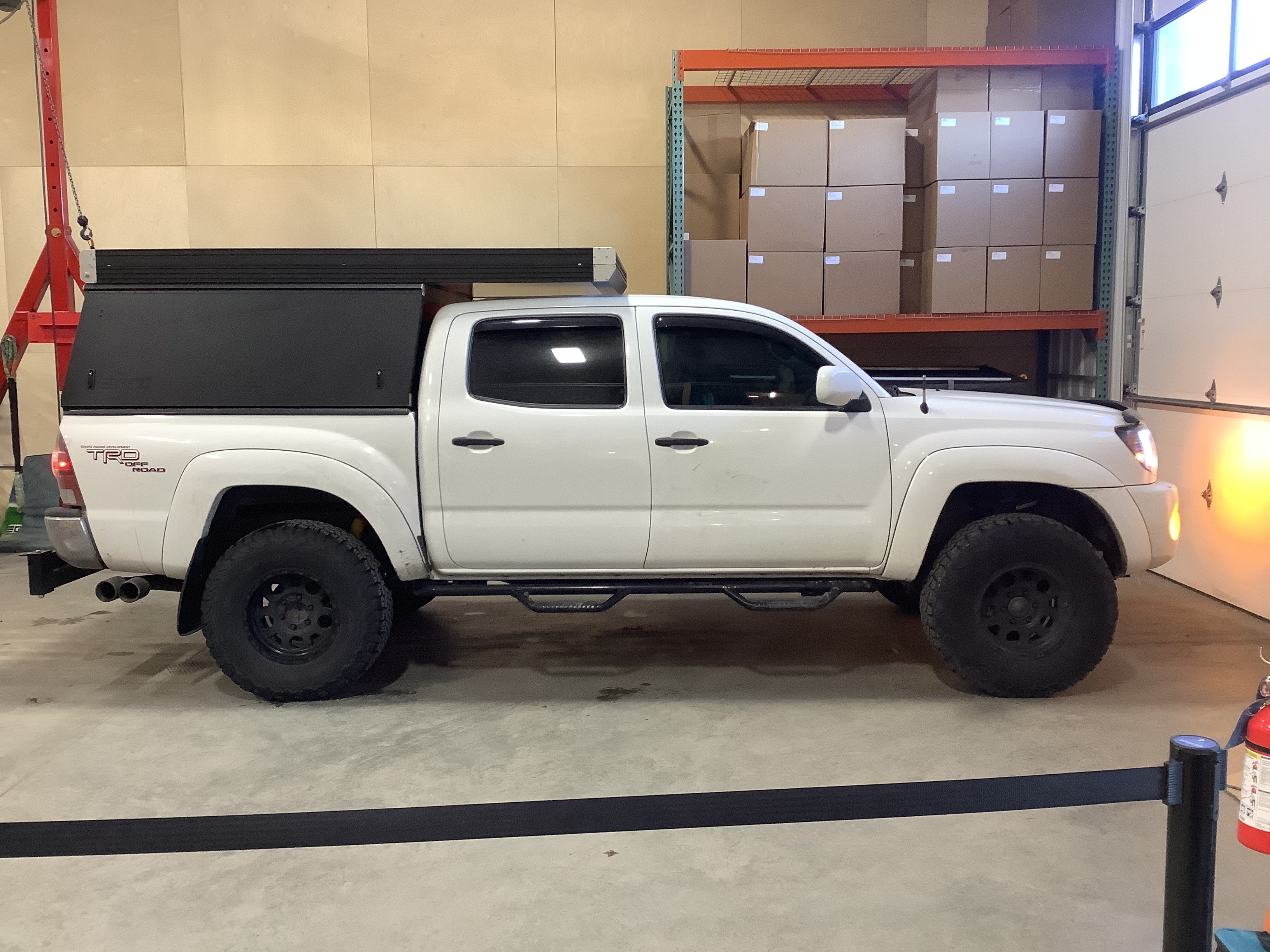 Product: Platform Camper Panel Color: Black GFC Options: Side Door, Windows Year: 2010 Make: Toyota Model: Tacoma Cab/Bed: Double Cab 5 foot Truck Color White Wheels: KMC Suspension: Dobinson Tire: BFG KO2 285/75/R16 Mods: All I need is a GFC Instagram Handle:@cris_tea_anh Install Date: 2022-03-17 Location: California