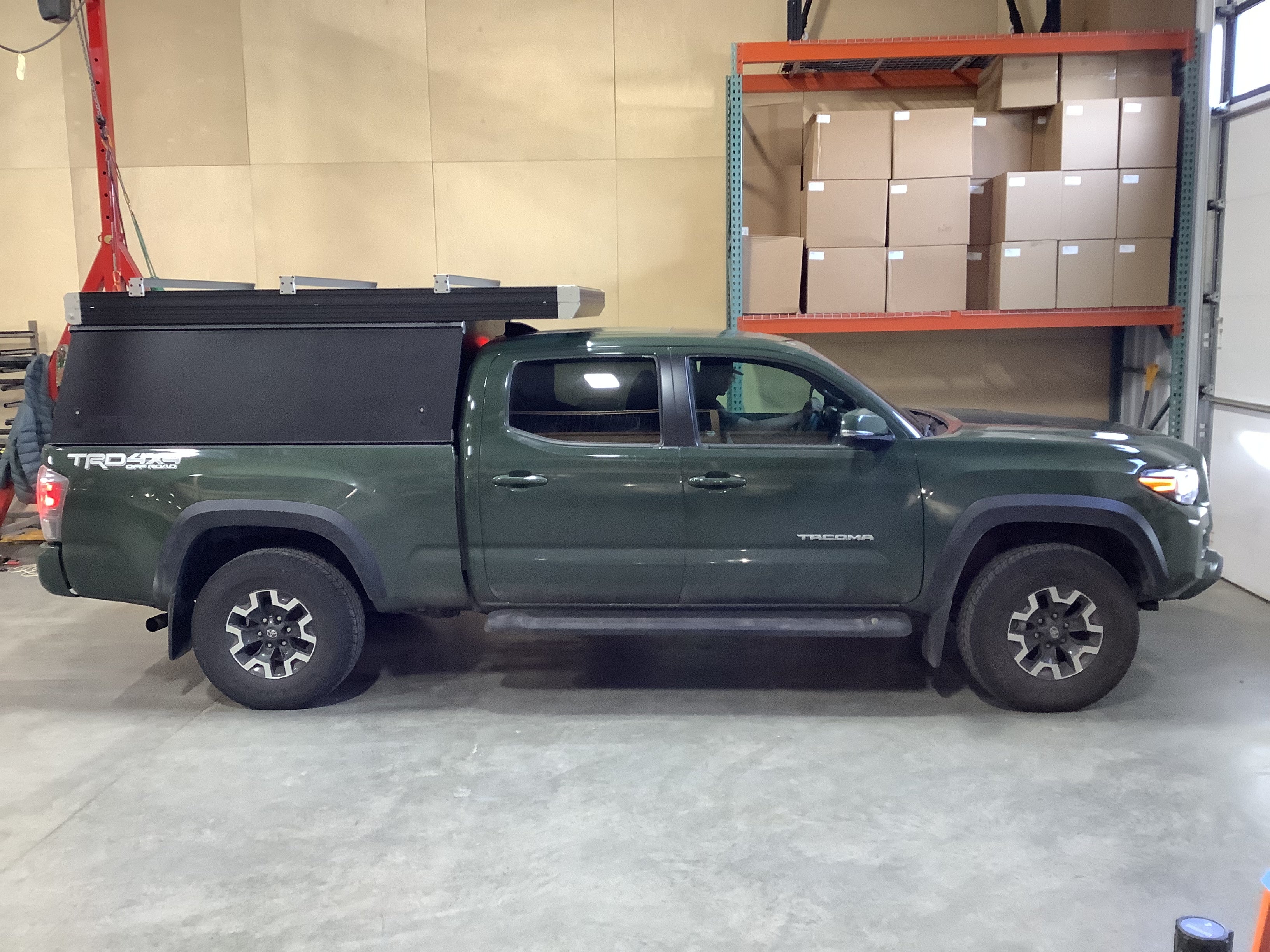 Product: Platform Camper Panel Color: Black GFC Options: Beef Rack, Windows, Side Door Year: 2021 Make: Toyota Model: Tacoma Cab/Bed: Double Cab 6 Foot Truck Color Green Wheels: Stock Suspension: Stock Tire: Goodyear Wrangler 265/70/R16 Mods: All I need is a GFC Instagram Handle: None Install Date: 2022-04-24 Location: Oregon