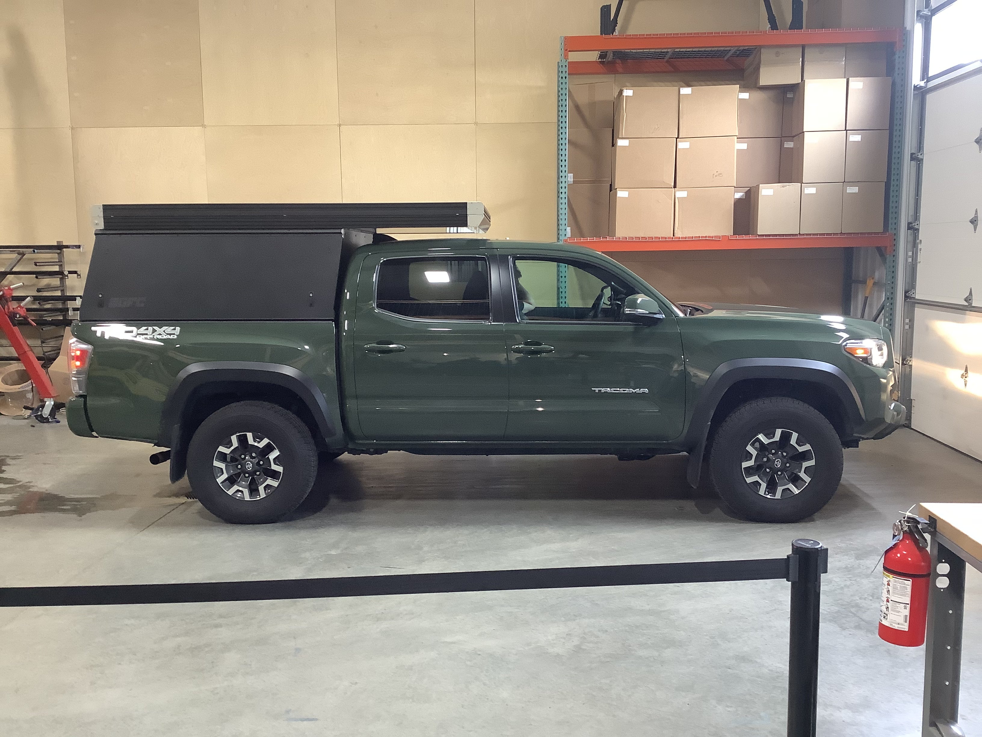 Product: Platform Camper Panel Color: Black GFC Options: Year: 2021 Make: Toyota Model: Tacoma Cab/Bed: Double Cab 5 foot Truck Color Green Wheels: Stock Suspension: Stock Tire: Goodyear Wrangler 265/70/R16 Mods: All I need is a GFC Instagram Handle: Install Date: 2022-05-28 Location: British Columbia