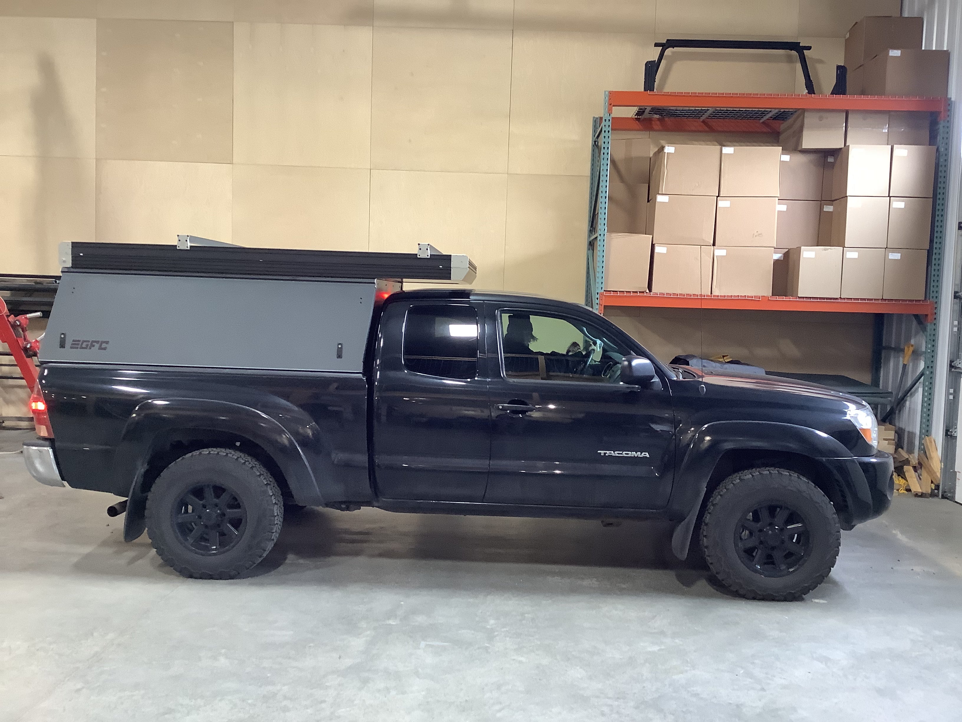 Product: Platform Camper Panel Color: Battleship Gray GFC Options: Windows, Side Door, Beef Rack Year: 2005 Make: Toyota Model: Tacoma Cab/Bed: Double Cab 6 Foot Truck Color Black Wheels: Stock Suspension: Stock Tire: BFG KO2 245/75/R16 Mods: All I need is a GFC Instagram Handle:None Install Date: 2022-04-30 Location: Washington
