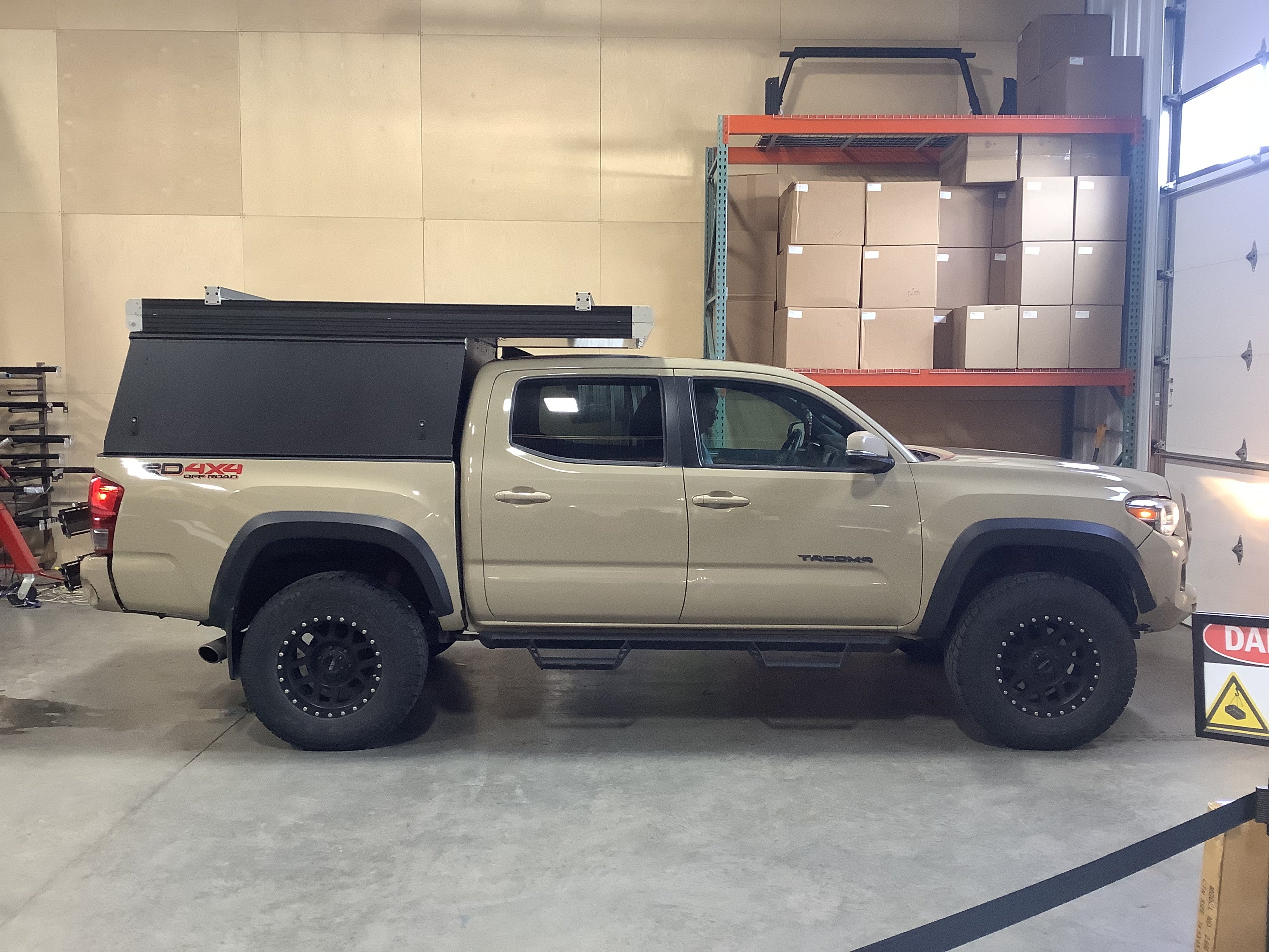 Product: Platform Camper Panel Color: Black GFC Options: Beef Rack Year: 2017 Make: Toyota Model: Tacoma Cab/Bed: Double Cab 5 foot Truck Color Tan Wheels: Method Suspension: Stock Tire: Toyo Open country 285/70/R17 Mods: All I need is a GFC Instagram Handle:Darwintaylor Install Date: 2022-05-29 Location: Utah