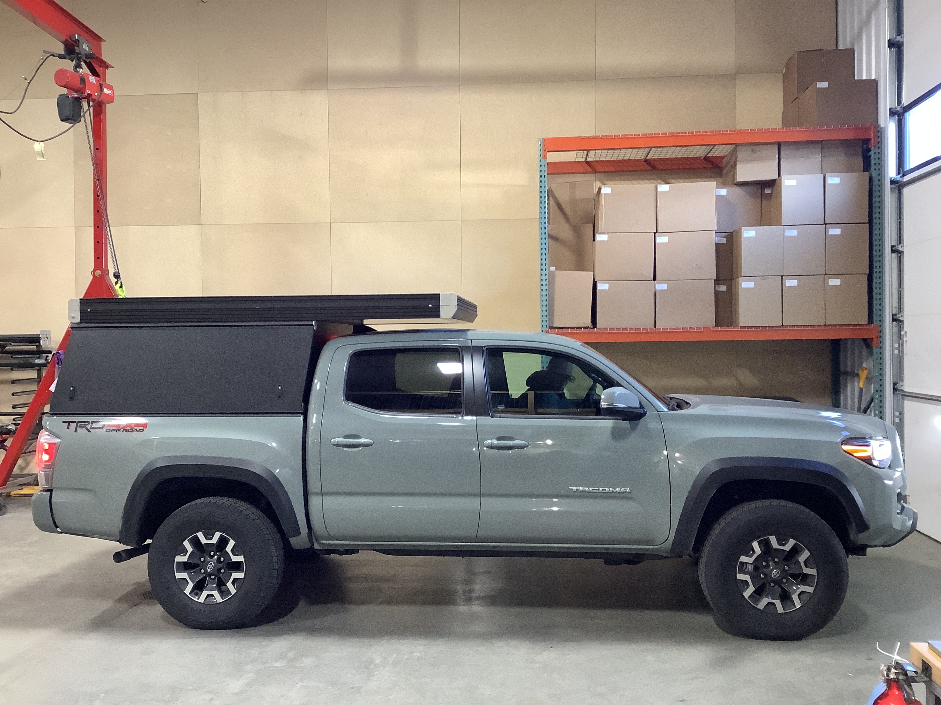 Product: Platform Camper Panel Color: Black GFC Options: Windows, Side Door Year: 2020 Make: Toyota Model: Tacoma Cab/Bed: Double Cab 5 foot Truck Color Gray Wheels: Stock Suspension: Stock Tire: Goodyear Wrangler 265/70/R16 Mods: All I need is a GFC Instagram Handle: None Install Date: 2022-04-09 Location: Washington