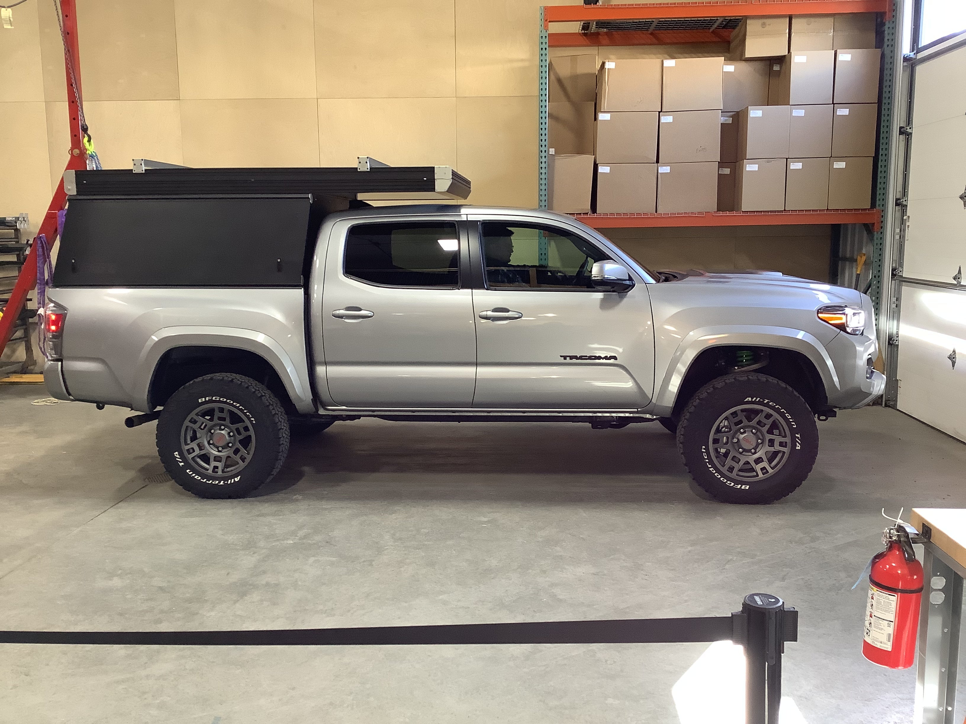 Product: Platform Camper Panel Color: Black GFC Options: Beef Rack, Side Door, Windows Year: 2021 Make: Toyota Model: Tacoma Cab/Bed: Double Cab 5 foot Truck Color Silver Wheels: Stock Suspension: Ironman Tire: BFG KO2 265/75/R16 Mods: All I need is a GFC Instagram Handle: @esser_ja Install Date: 2022-04-17 Location: Oregon