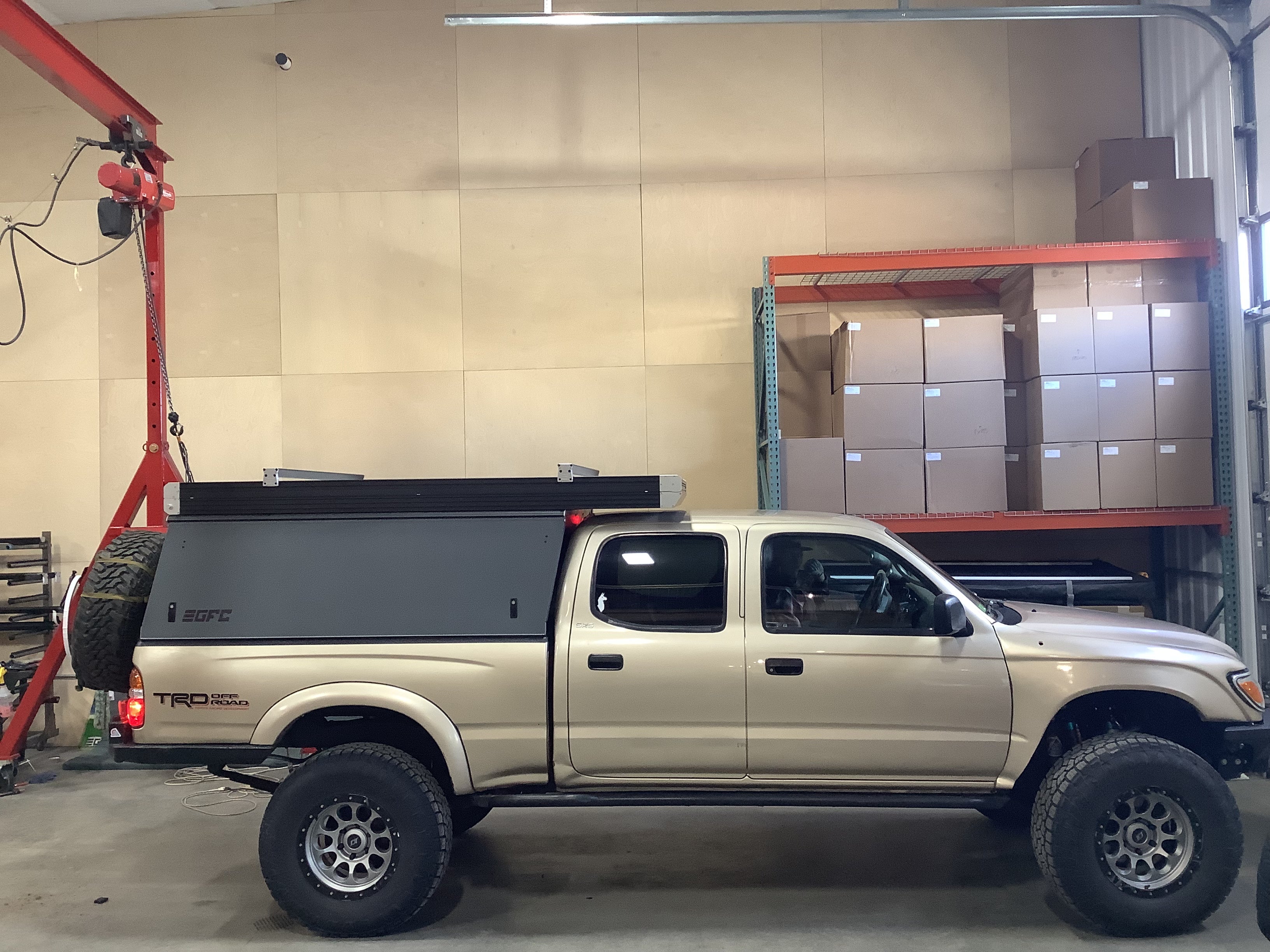Product: Platform Camper Panel Color: Battleship Gray GFC Options: Beef Rack, Side Door Year: 2001 Make: Toyota Model: Tacoma Cab/Bed: Double Cab 6 Foot Truck Color Tan Wheels: SCS Suspension: Total Chaos, King Tire: Toyo Open Country AT 285/75/R17 Mods: All I need is a GFC Instagram Handle: @303shocks Install Date: 2022-03-18 Location: Colorado