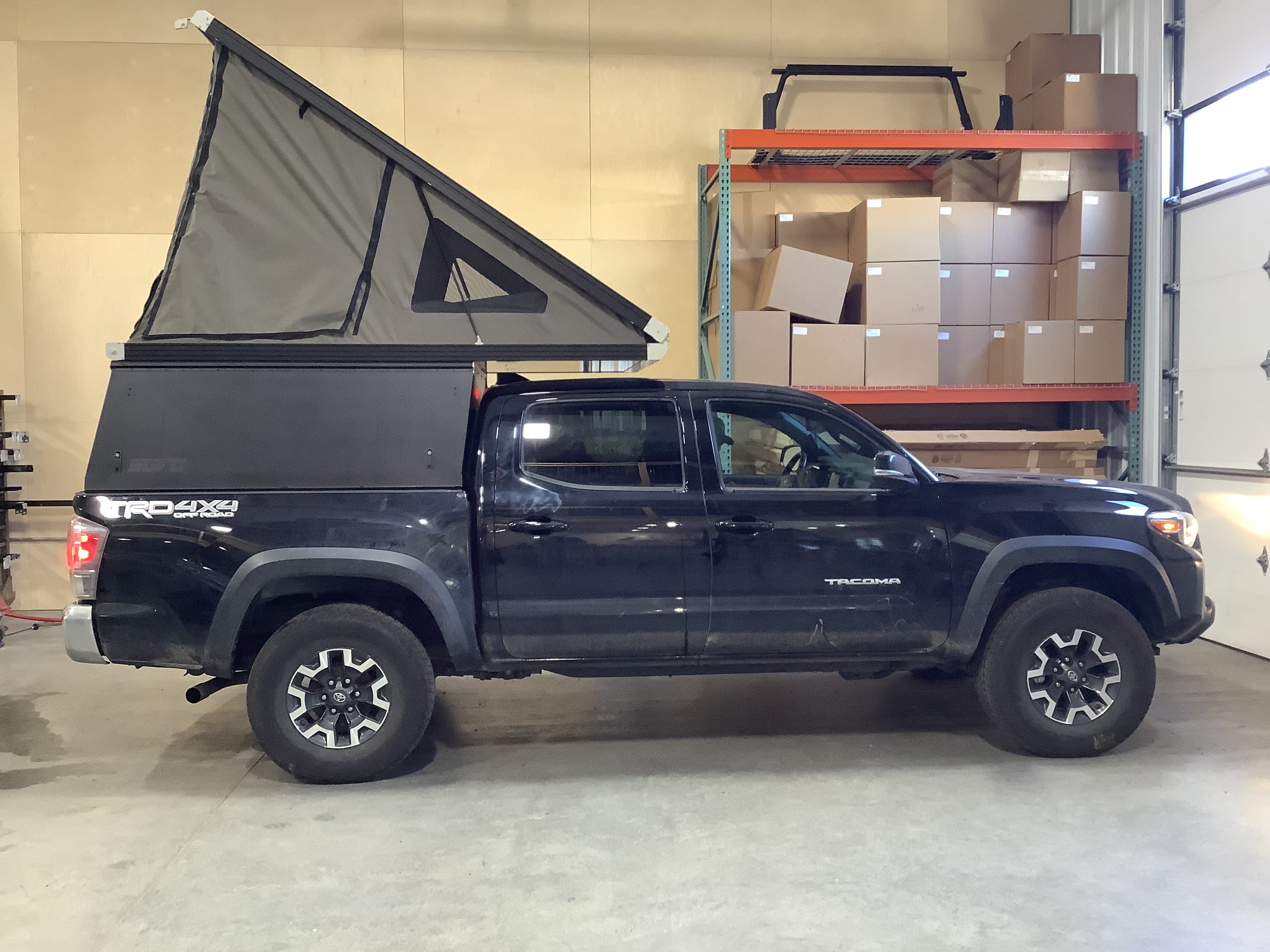 Product: Platform Camper Panel Color: Black GFC Options: Windows, Side Door Year: 2021 Make: Toyota Model: Tacoma Cab/Bed: Double Cab 5 foot Truck Color Black Wheels: Stock Suspension: Stock, Bilstein Tire: Goodyear Wrangler 265/70/R16 Mods: All I need is a GFC Instagram Handle: Install Date: 2022-06-17 Location: Colorado