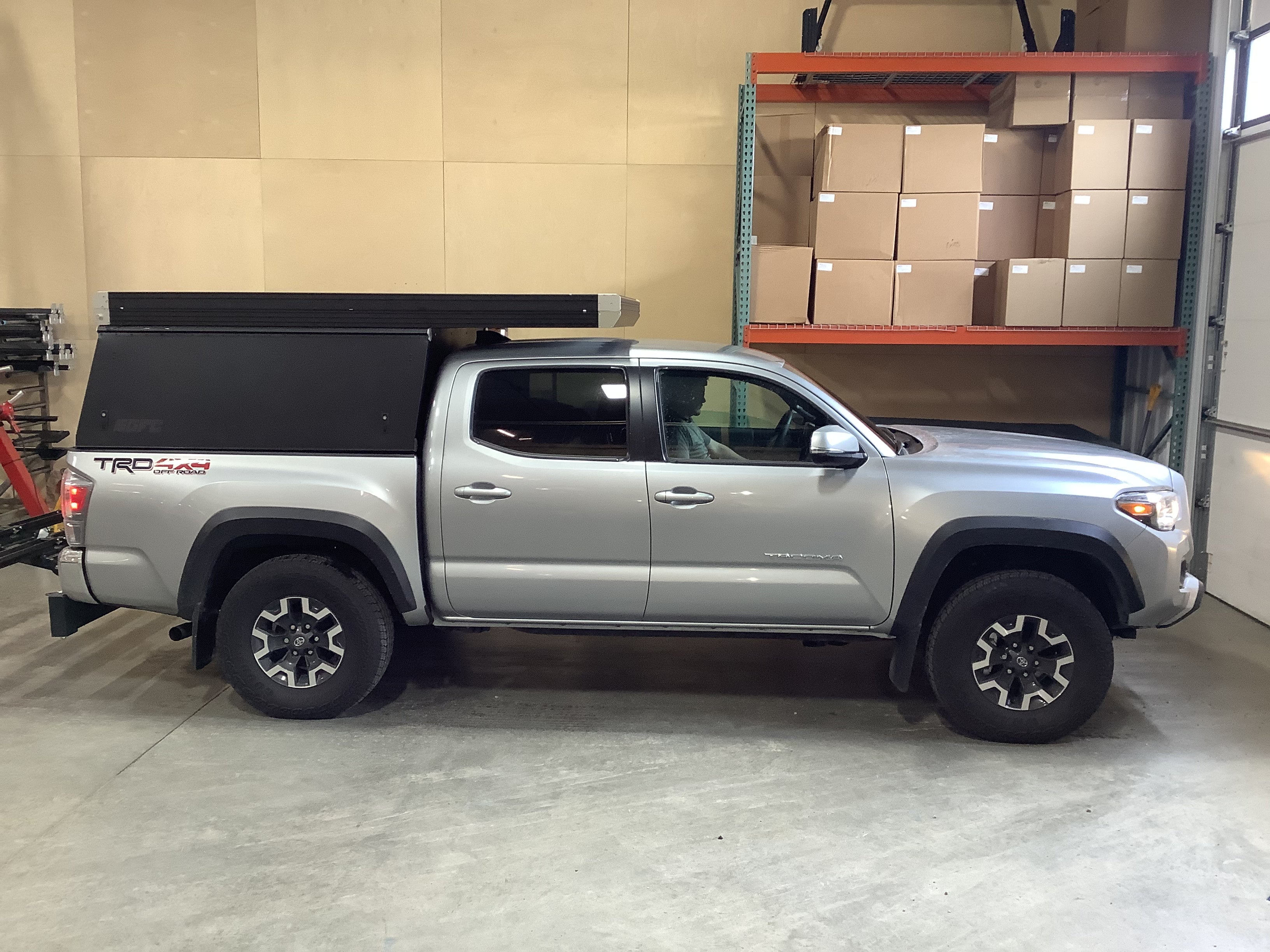 Product: Platform Camper Panel Color: Black GFC Options: Windows Year: 2022 Make: Toyota Model: Tacoma Cab/Bed: Double Cab 5 foot Truck Color Silver Wheels: Stock Suspension: Stock Tire: Goodyear Wrangler 265/70/R16 Mods: All I need is a GFC Instagram Handle:@michaelerea Install Date: 2022-04-29 Location: California