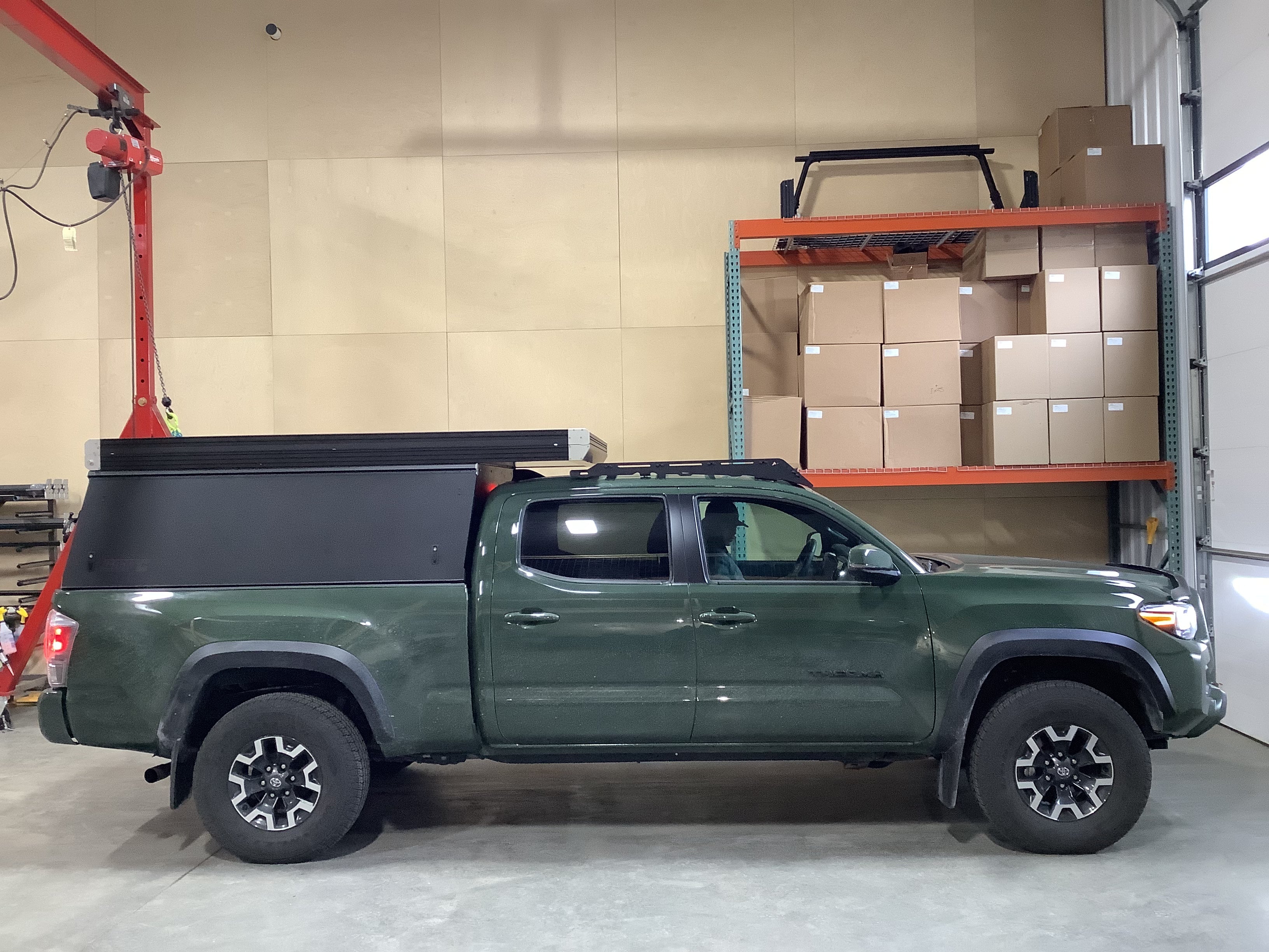 Product: Platform Camper Panel Color: Black GFC Options: Side Door, Windows Year: 2021 Make: Toyota Model: Tacoma Cab/Bed: Double Cab 6 Foot Truck Color Green Wheels: Stock Suspension: Stock Tire: Goodyear Wrangler 265/70/R16 Mods: All I need is a GFC Instagram Handle:None Install Date: 2022-04-16 Location: Utah