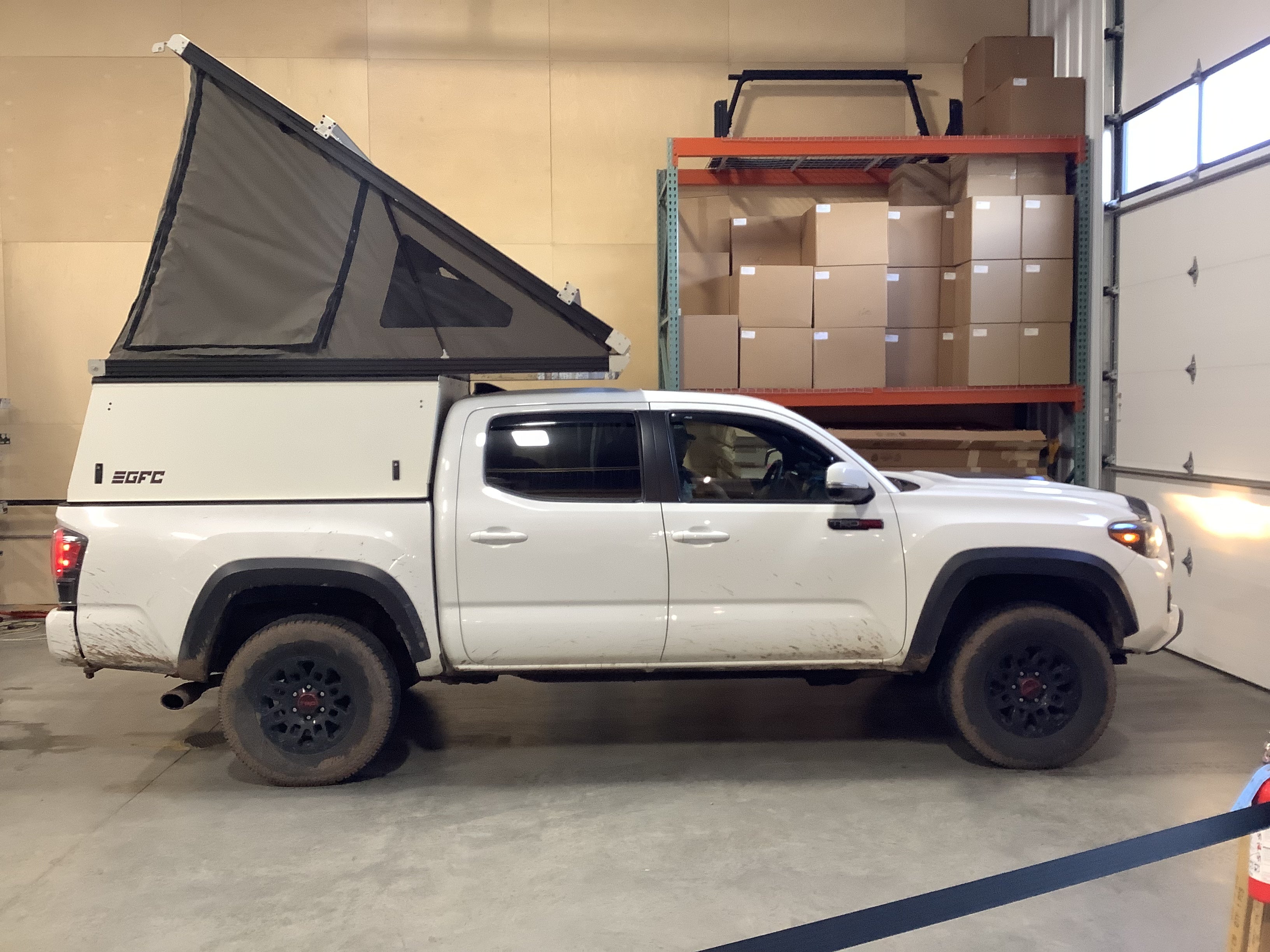 Product: Platform Camper Panel Color: White GFC Options: Beef Rack Year: 2019 Make: Toyota Model: Tacoma Cab/Bed: Double Cab 5 foot Truck Color White Wheels: Stock Suspension: SPC, Stock Tire: Yokohama Geolander 265/70/R17 Mods: All I need is a GFC Instagram Handle:Stephannix Install Date: 2022-06-09 Location: New Hampshire
