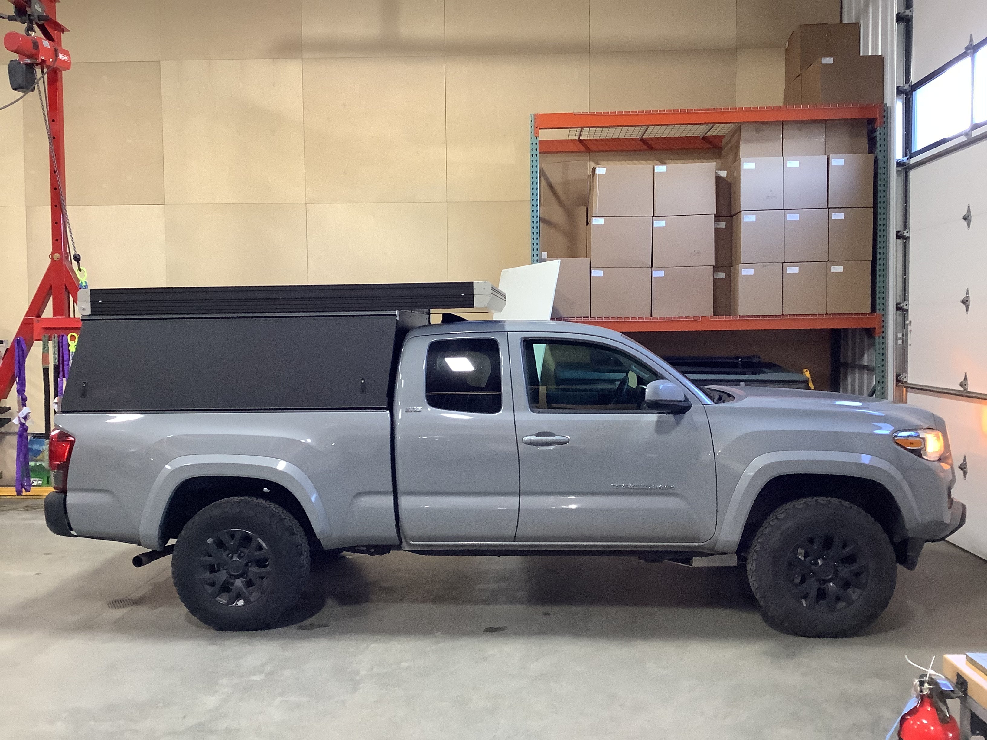 Product: Platform Camper Panel Color: Black GFC Options: Windows, Side Door Year: 2019 Make: Toyota Model: Tacoma Cab/Bed: Access Cab 6 Foot Truck Color Gray Wheels: Stock Suspension: Stock Tire: BFG KO2 265/70/R16 Mods: All I need is a GFC Instagram Handle:None Install Date: 2022-03-27 Location: Colorado