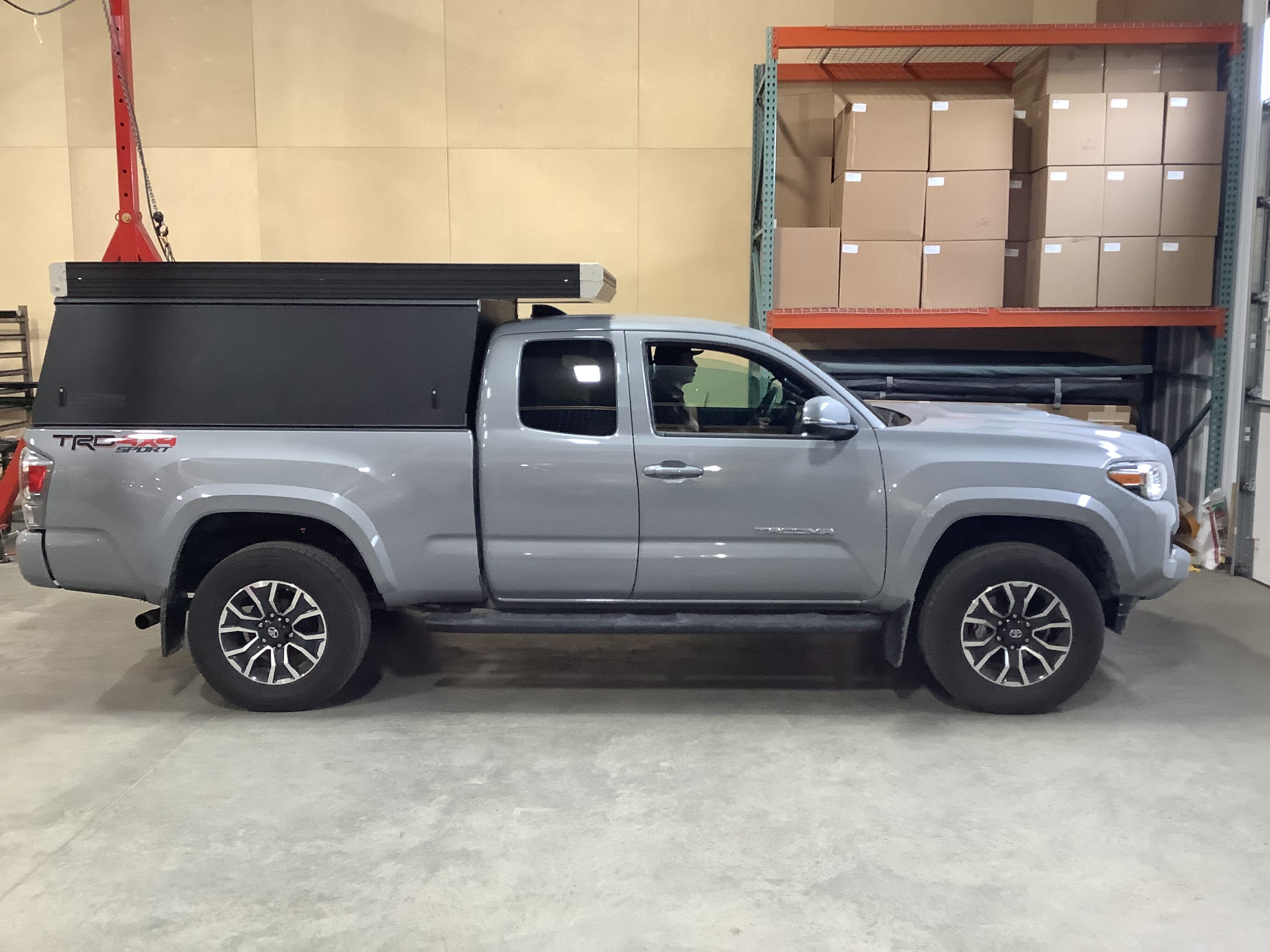 Product: Platform Camper Panel Color: Black GFC Options: Windows, Side Door Year: 2021 Make: Toyota Model: Tacoma Cab/Bed: Access Cab 6 Foot Truck Color Gray Wheels: Stock Suspension: Stock Tire: Goodyear Wrangler 265/70/R16 Mods: All I need is a GFC Instagram Handle: @rhiannondk Install Date: 2022-03-19 Location: California