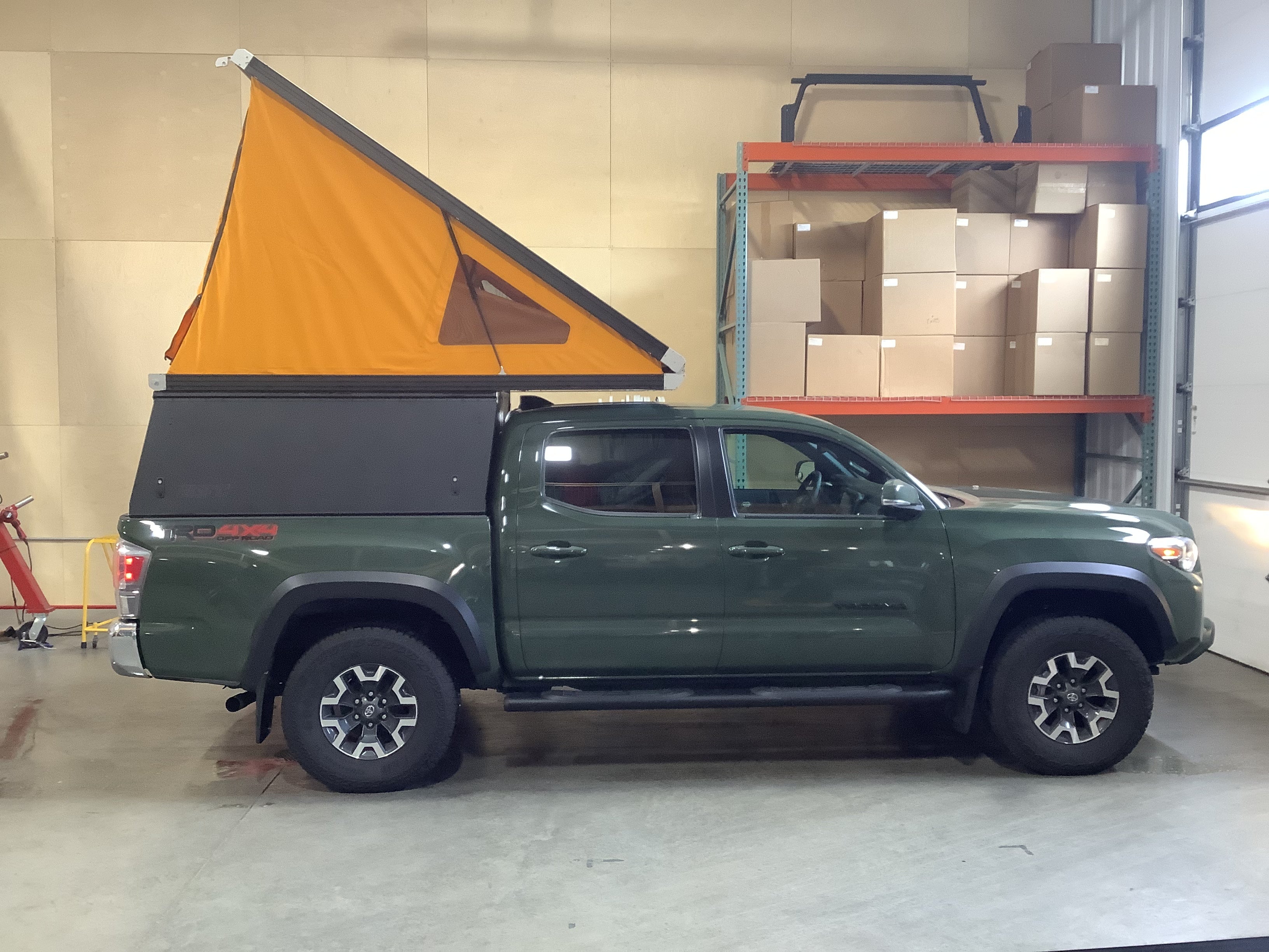 Product: Platform Camper Panel Color: Black GFC Options: Windows Year: 2022 Make: Toyota Model: Tacoma Cab/Bed: Double Cab 5 foot Truck Color Green Wheels: Stock Suspension: Stock Tire: Goodyear Wrangler 265/70/R16 Mods: All I need is a GFC Instagram Handle:@Capt.Red_Beard_ Install Date: 2022-08-06 Location: OH