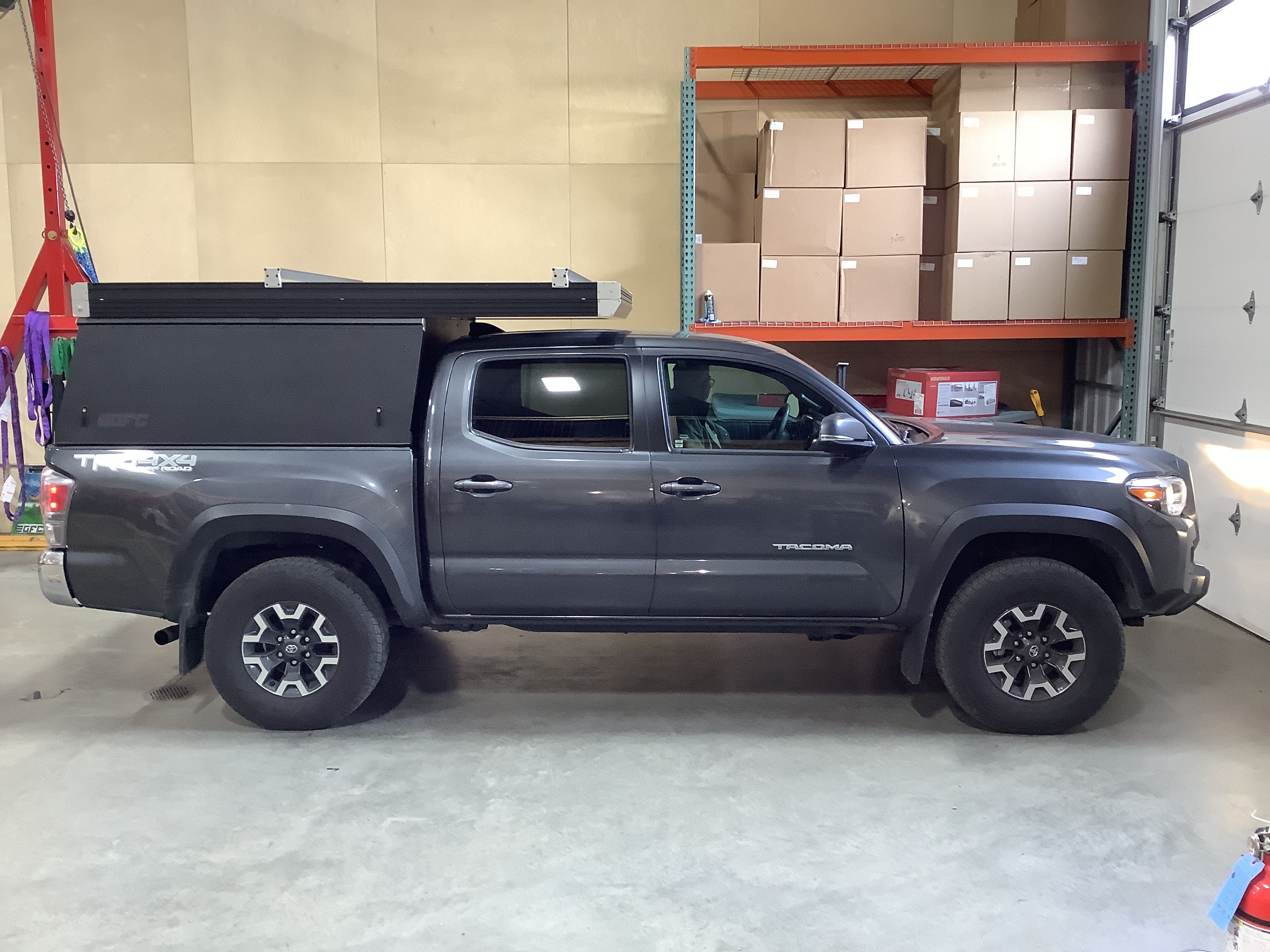 Product: Platform Camper Panel Color: Black GFC Options: Beef Rack, Windows, Side Door Year: 2021 Make: Toyota Model: Tacoma Cab/Bed: Double Cab 5 foot Truck Color Gray Wheels: Stock Suspension: Stock Tire: Goodyear Wrangler 265/60/R16 Mods: All I need is a GFC Instagram Handle:None Install Date: 2022-04-03 Location: Washington