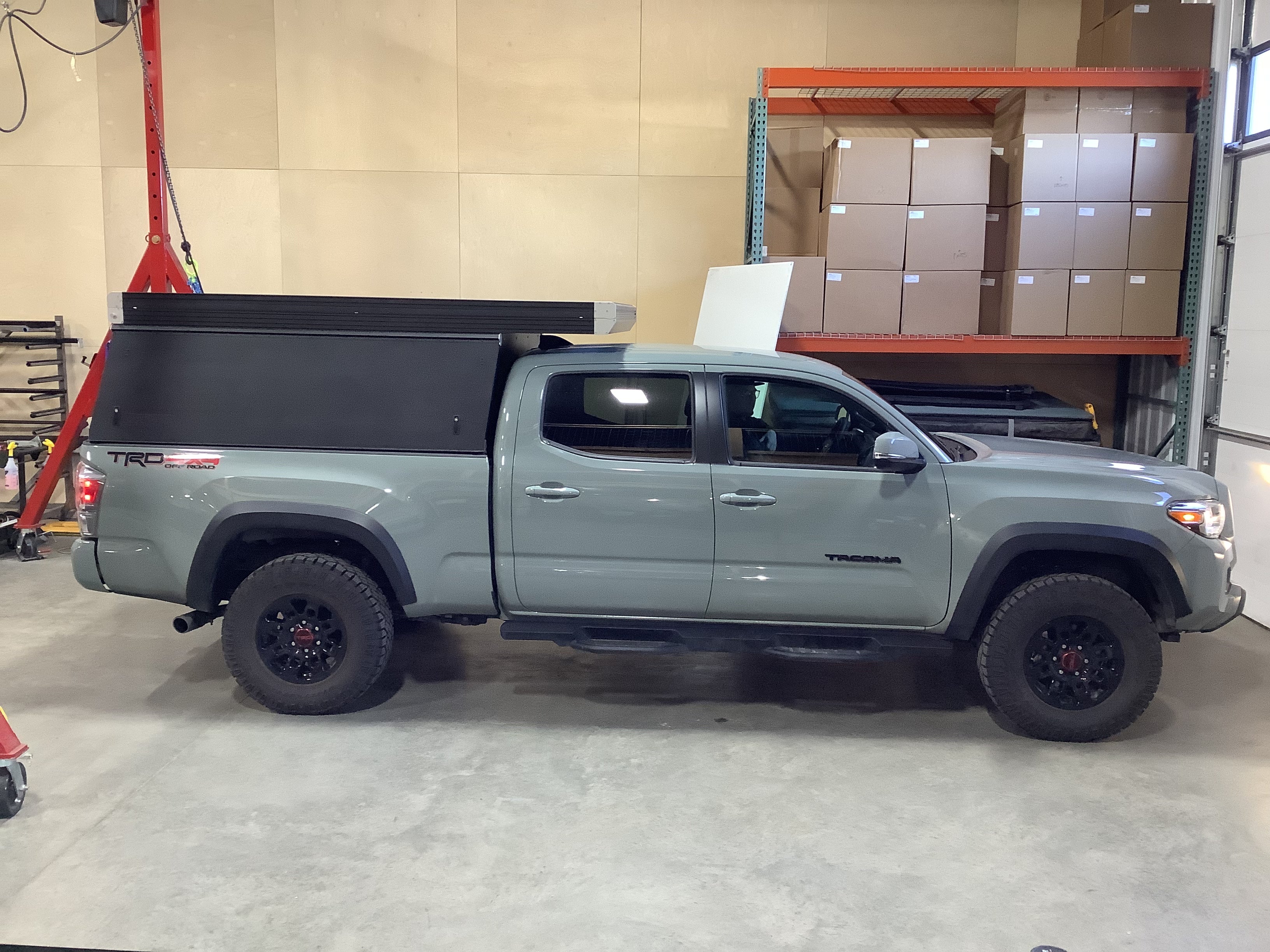 Product: Platform Camper Panel Color: Black GFC Options: Windows, Side Door Year: 2022 Make: Toyota Model: Tacoma Cab/Bed: Double Cab 6 Foot Truck Color Gray Wheels: Stock Suspension: Stock Tire: Goodyear Duratrac 265/70/R16 Mods: All I need is a GFC Instagram Handle: None Install Date: 2022-03-27 Location: Montana