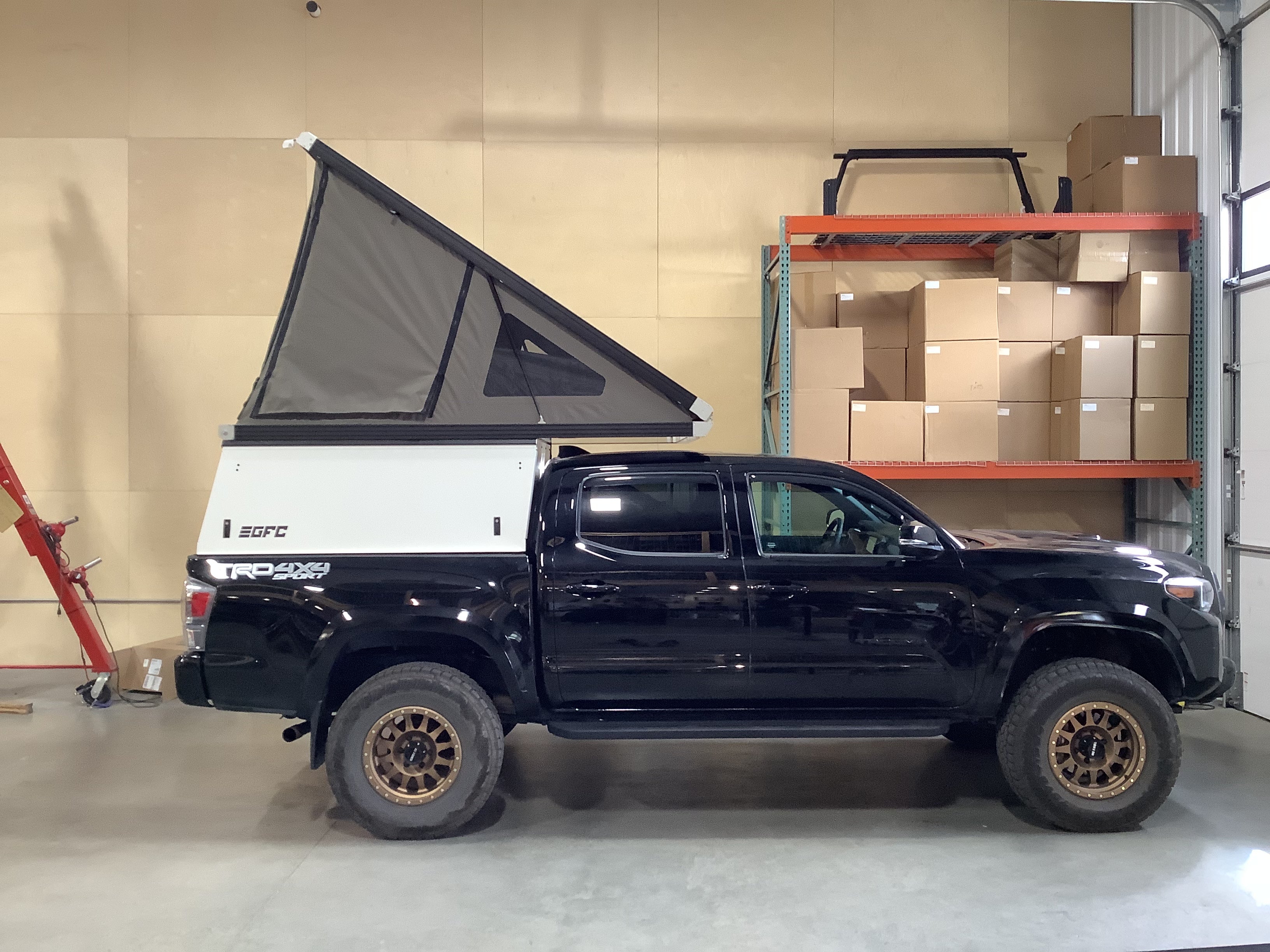 Product: Platform Camper Panel Color: White GFC Options: Windows, Side Door Year: 2021 Make: Toyota Model: Tacoma Cab/Bed: Double Cab 5 foot Truck Color Black Wheels: Method Suspension: Bilstein Tire: Toyo Open Country 285/70/R17 Mods: All I need is a GFC Instagram Handle: Install Date: 2022-07-22 Location: UT