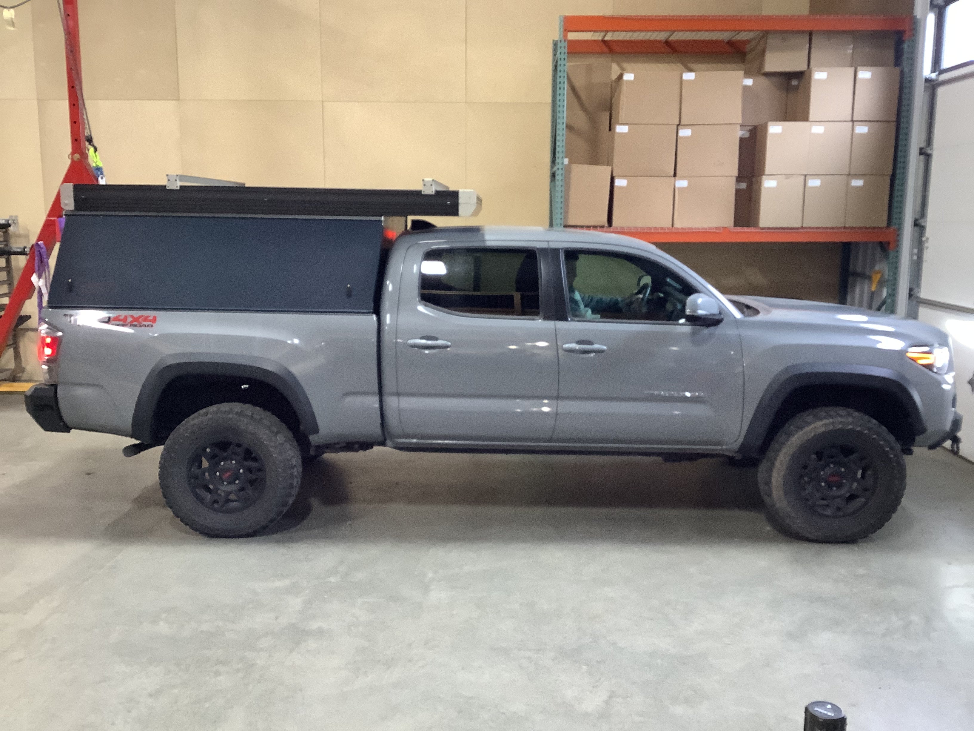 Product: Platform Camper Panel Color: Destroyer Blue GFC Options: Windows, Side Door, Beef Rack Year: 2020 Make: Toyota Model: Tacoma Cab/Bed: Double Cab 6 Foot Truck Color Gray Wheels: Stock Suspension: Old Man Emu/ARB Tire: Cooper Discoverer STMAX 275/70/R17 Mods: All I need is a GFC Instagram Handle:@reedbradburn Install Date: 2022-04-10 Location: Utah