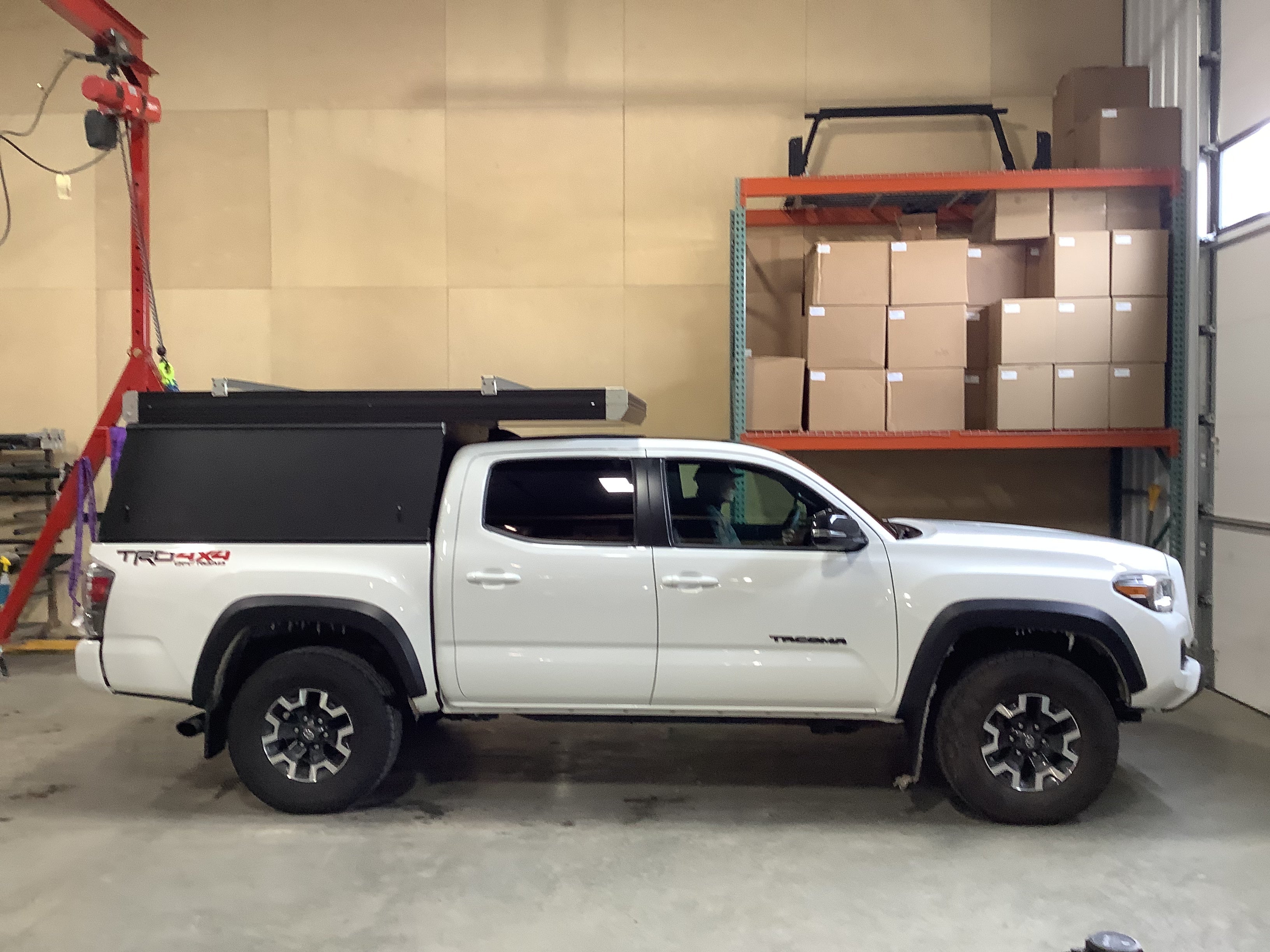 Product: Platform Camper Panel Color: Black GFC Options: Beef Rack, Side Door, Windows Year: 2020 Make: Toyota Model: Tacoma Cab/Bed: Double Cab 5 foot Truck Color White Wheels: Stock Suspension: Stock Tire: Goodyear Wrangler 265/70/R16 Mods: All I need is a GFC Instagram Handle: None Install Date: 2022-04-14 Location: California