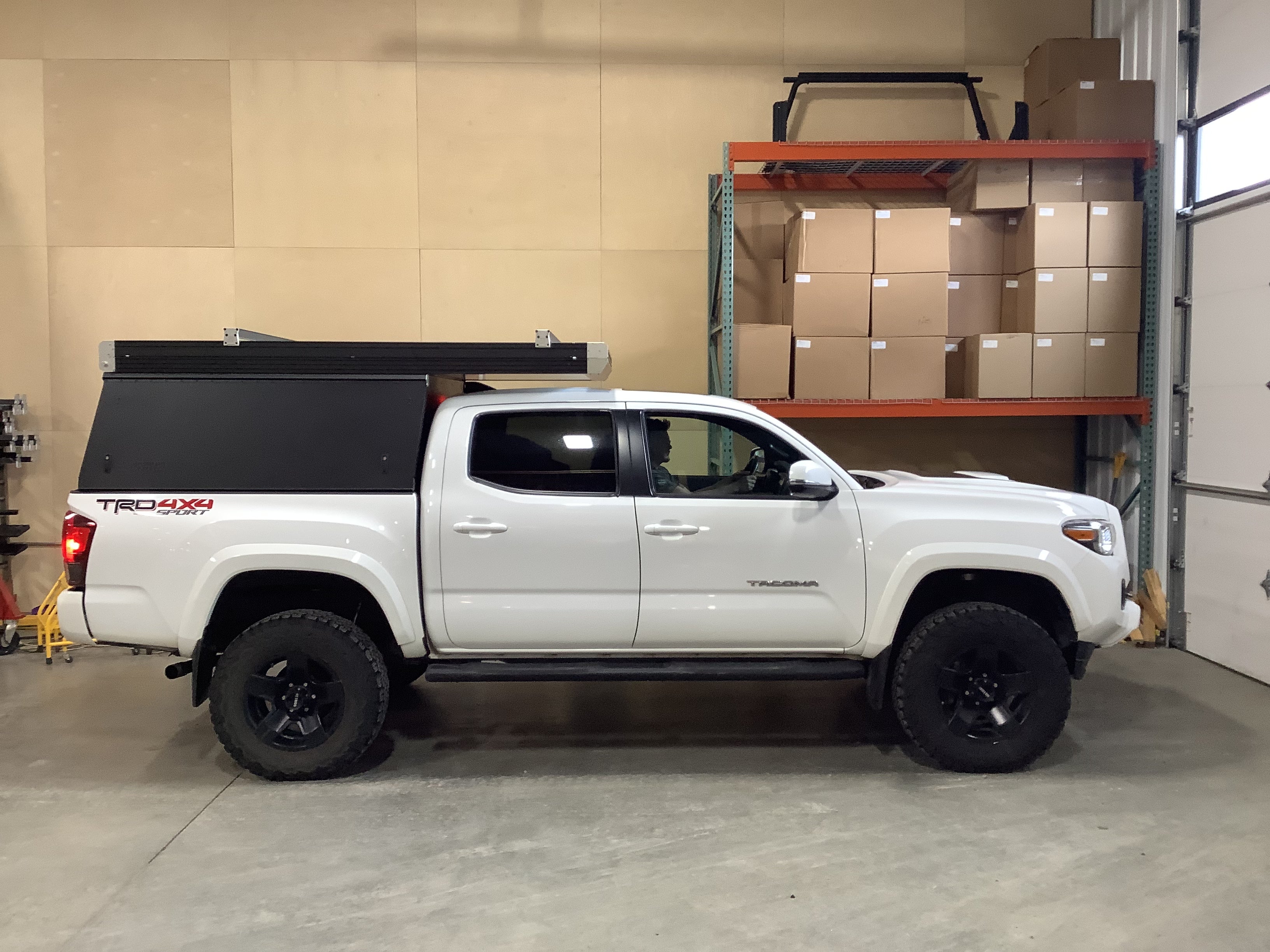 Product: Platform Camper Panel Color: Black GFC Options: Windows, Side Door, Beef Rack Year: 2018 Make: Toyota Model: Tacoma Cab/Bed: Double Cab 5 foot Truck Color White Wheels: Stock Suspension: Stock Tire: BFG KO2 265/70/R17 Mods: All I need is a GFC Instagram Handle:@scalleywags13 Install Date: 2022-04-29 Location: Oregon