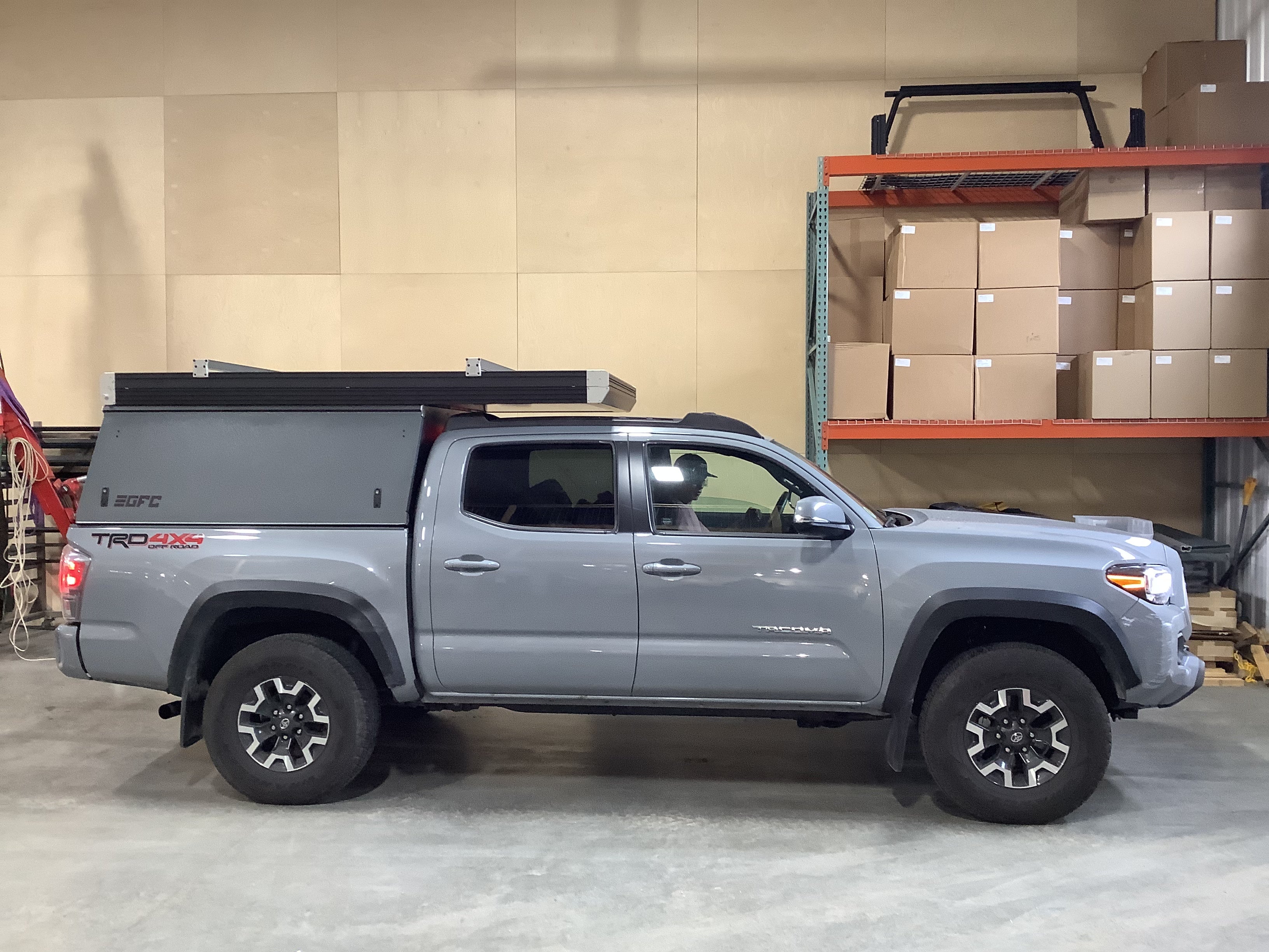 Product: Platform Camper Panel Color: Battleship Gray GFC Options: Windows, Side Door Year: 2021 Make: Toyota Model: Tacoma Cab/Bed: Double Cab 5 foot Truck Color Gray Wheels: Stock Suspension: Stock Tire: Goodyear Wrangler 265/70/R16 Mods: All I need is a GFC Instagram Handle: None Install Date: 2022-05-01 Location: California