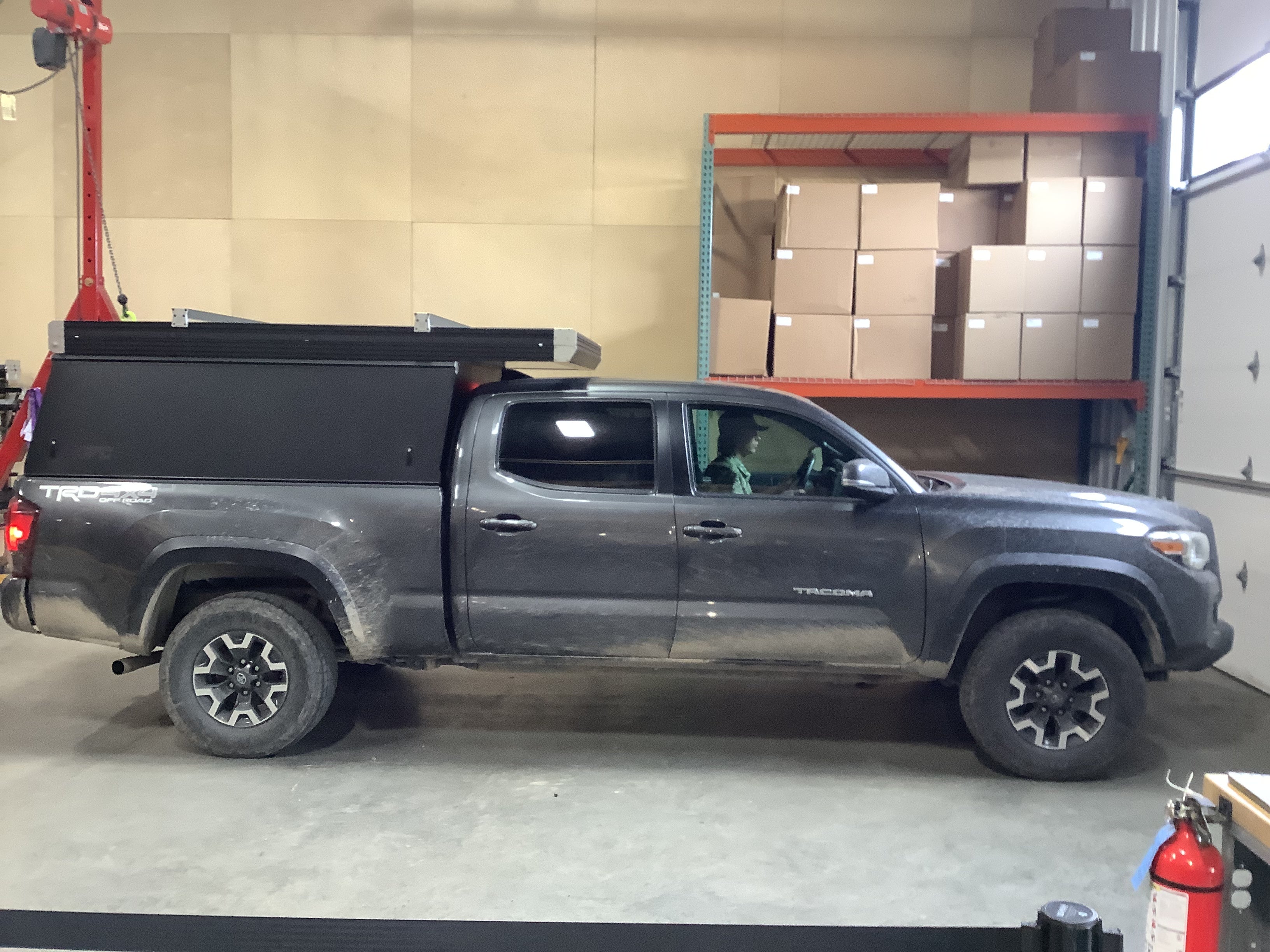 Product: Platform Camper Panel Color: Black GFC Options: Beef Rack, Side Door, Windows Year: 2018 Make: Toyota Model: Tacoma Cab/Bed: Double Cab 6 Foot Truck Color Gray Wheels: Stock Suspension: Stock Tire: Goodyear Wrangler 265/60/R17 Mods: All I need is a GFC Instagram Handle: @kaya88 Install Date: 2022-04-08 Location: California
