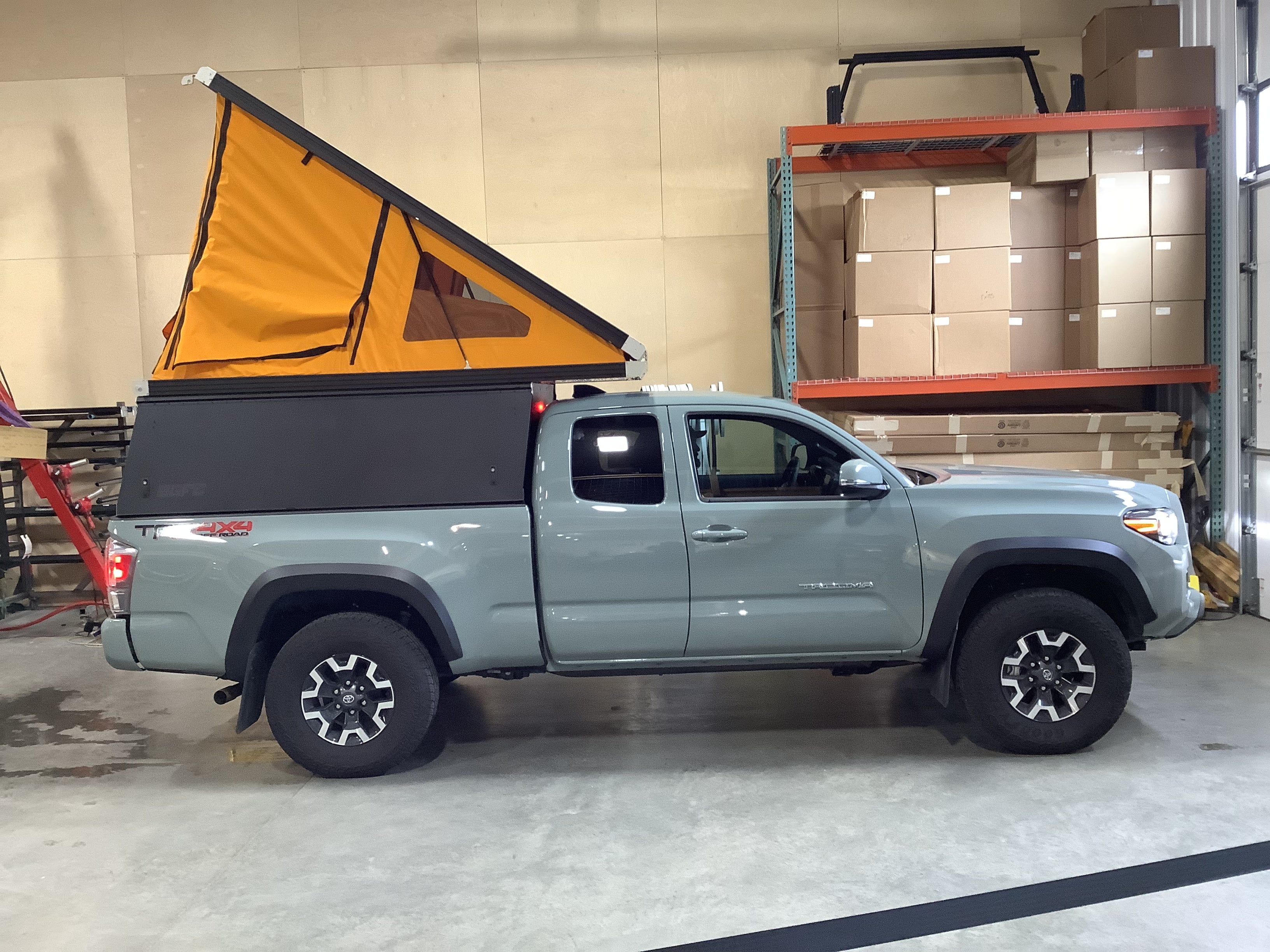 Product: Platform Camper Panel Color: Black GFC Options: Side Door Year: 2022 Make: Toyota Model: Tacoma Cab/Bed: Access Cab 6 Foot Truck Color Gray Wheels: Stock Suspension: Stock Tire: Goodyear Wrangler 265/70/R16 Mods: All I need is a GFC Instagram Handle:None Install Date: 2022-06-05 Location: Oregon